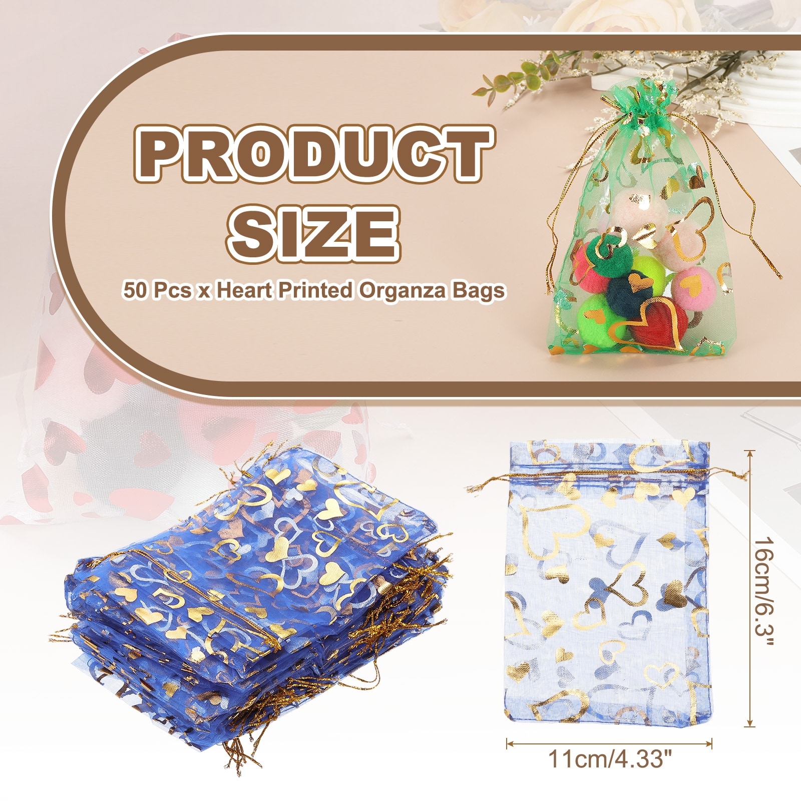 Heart Printed Organza Bags, Green Sheer Heart Organza Bags with Drawstring for Christmas Candy Jewelry Party Favor Gift - 4x6 In
