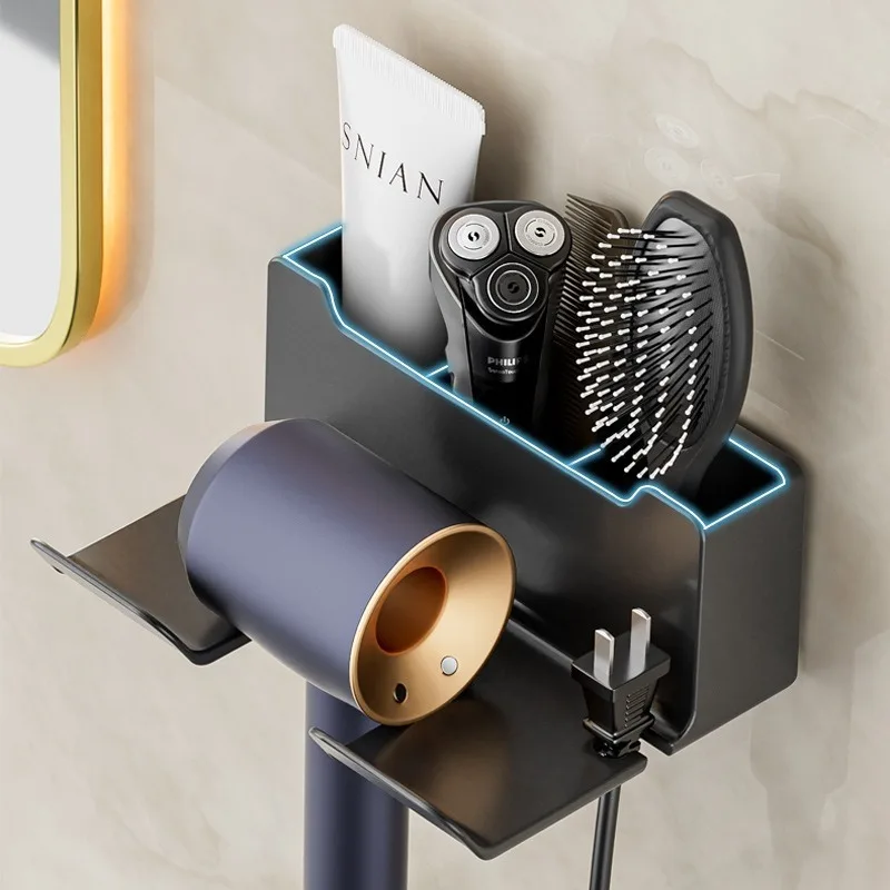 No Punching Hair Dryer Holder Makeup Hair Tool Storage Rack Wall Shaver Comb Sundries Shelf Bathroom Organizer Home Accessories black