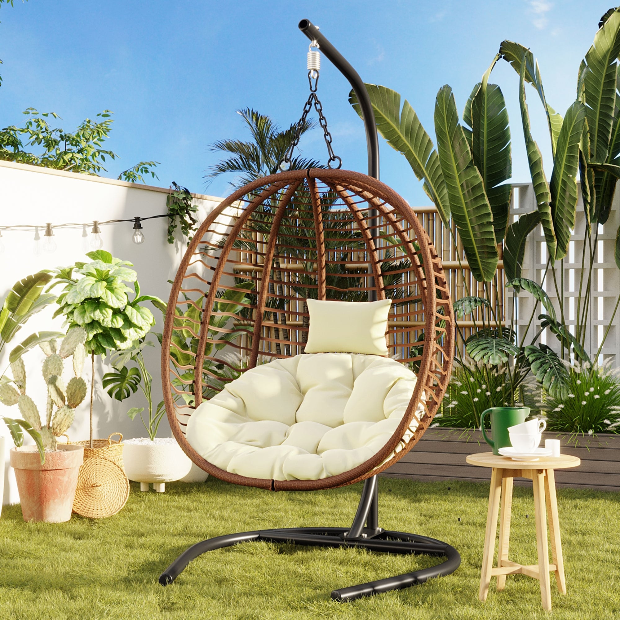 Hanging Chair PE Hanging Chair with Stainless Steel Suspension kit, Outdoor Garden Rattan Egg Swing Chair with Cushion