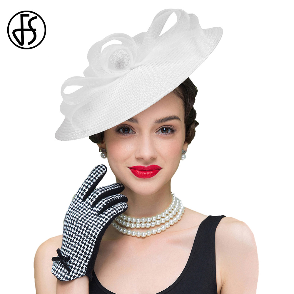 FS Summer White Champagne Straw Church Hats For Women, Wide Brim Wedding Hat, Elegant Cocktail Tea Party Fascinators champagne one Size