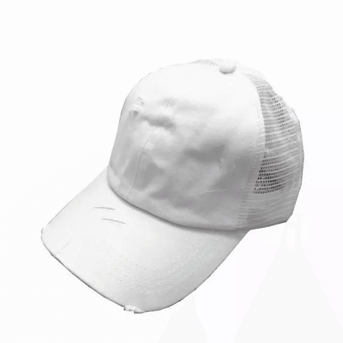 Plain Adjustable Mesh Back Ponytail Baseball Cap, Polo Style Cotton Distressed Mesh Caps white