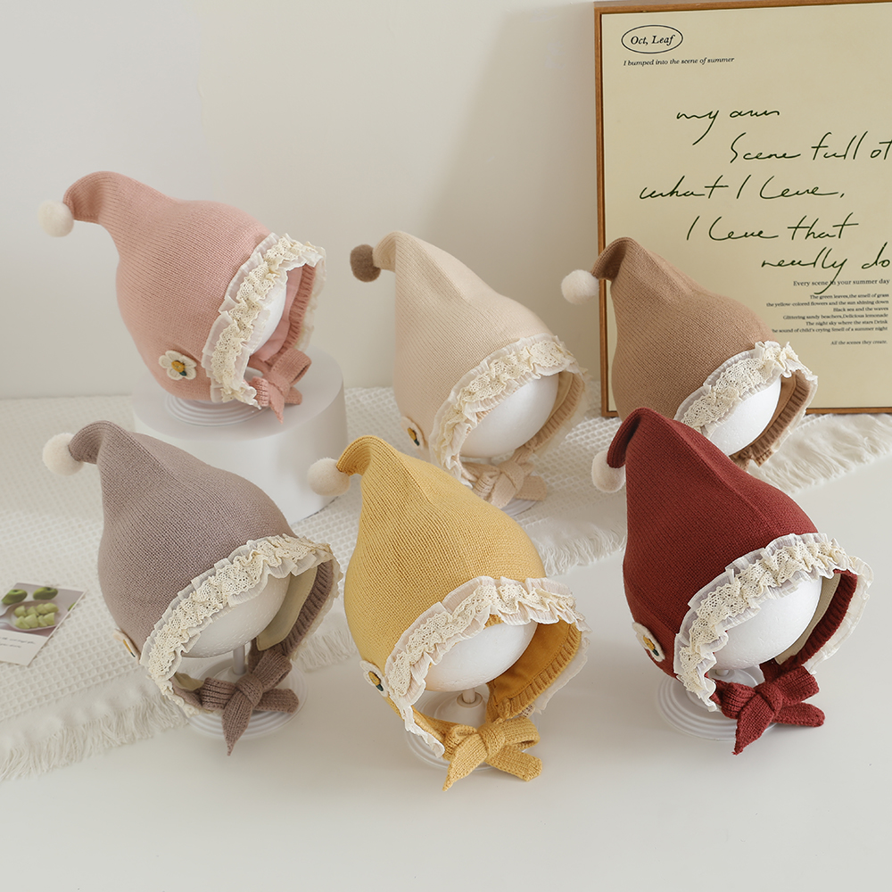 Warm Winter Baby Hat With Lace Brim Pompom Flower For Girls Outdoor Protection Cap coffee