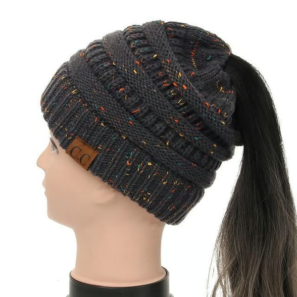Soft Knit Ponytail Confetti Beanie Dark Gray