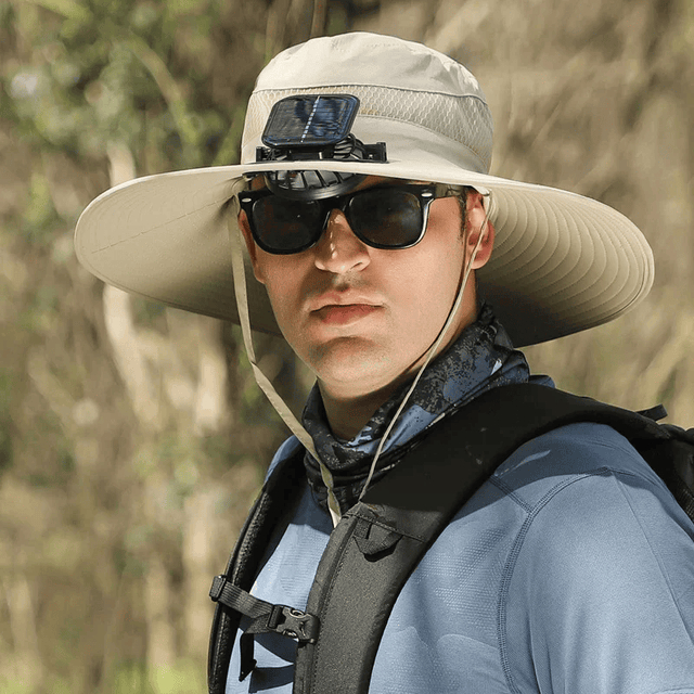 Outdoor Wide Brim Sun Hat With Solar Fan Khaki