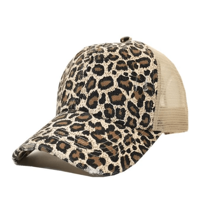 Plain Adjustable Mesh Back Ponytail Baseball Cap, Polo Style Cotton Distressed Mesh Caps leopard