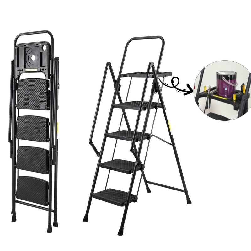 Foldable Steel Ladder with Tool Tray & Non-Slip Pedals - Lightweight Portable Step Stool with Safety Handles for Home Use