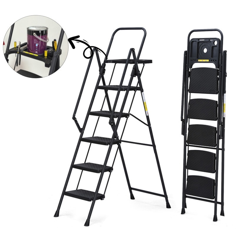 Foldable Steel Ladder with Tool Tray & Non-Slip Pedals - Lightweight Portable Step Stool with Safety Handles for Home Use