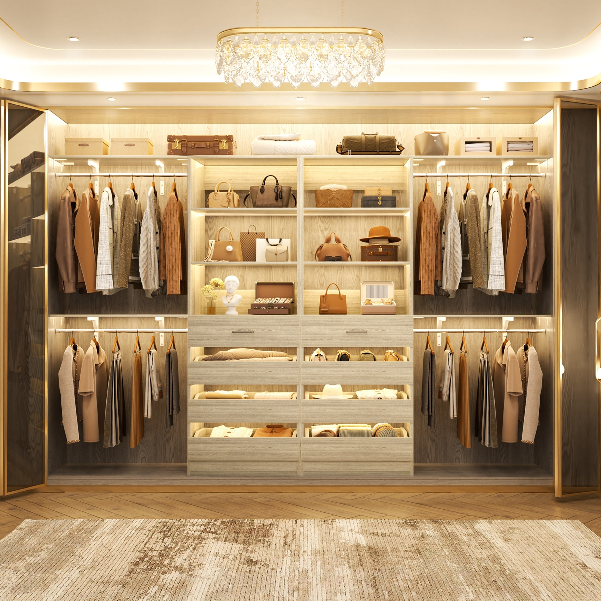 Set of 2 Closet System with Wooden Drawers and Hanging Rods, Closet Organizer with Adjustable Storage Shelves