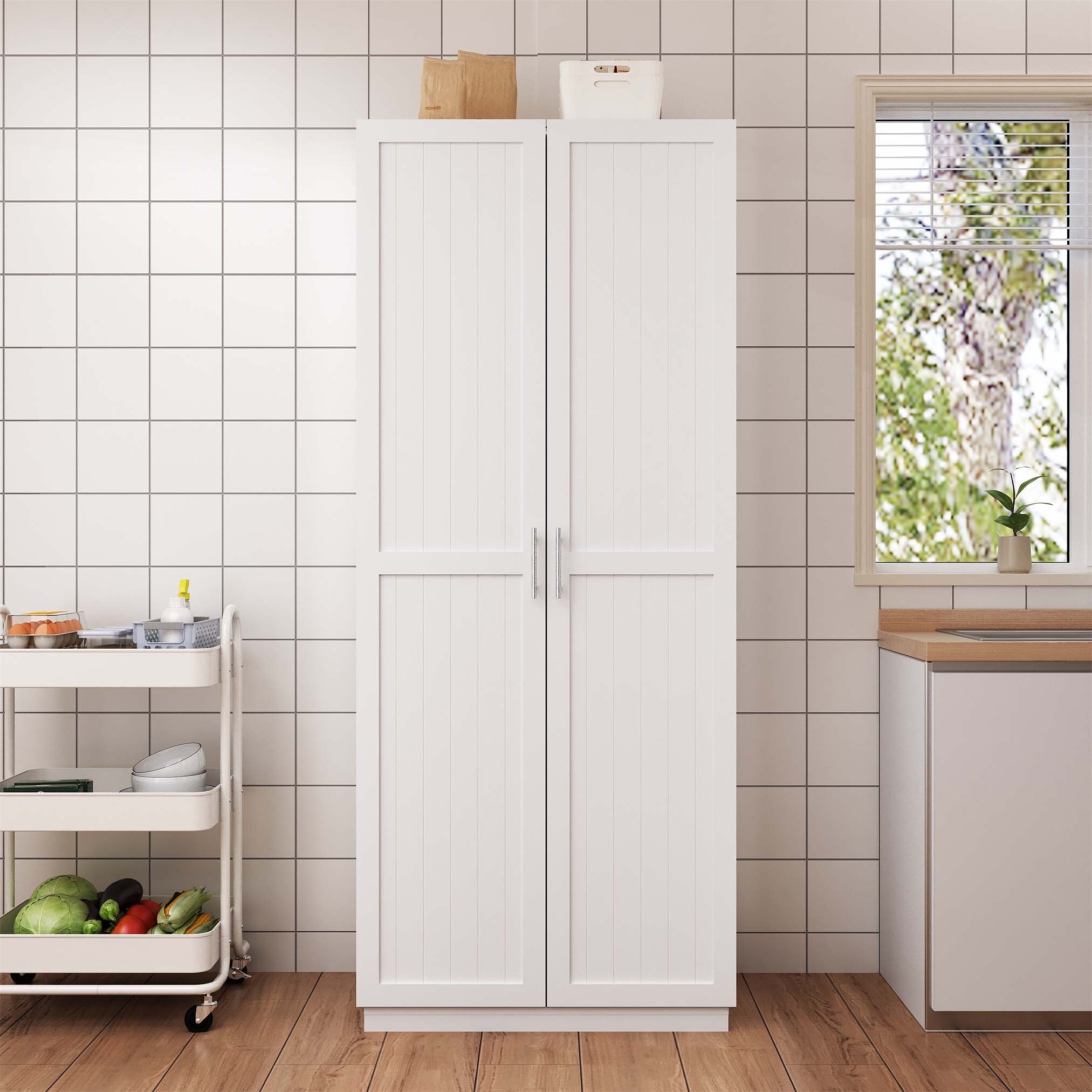 4-Tier 72 Inch Corner Kitchen Pantry Storage Cabinet with 8 Doors, Tall Shelves, and Elegant Cherry Finish for Home Organization
