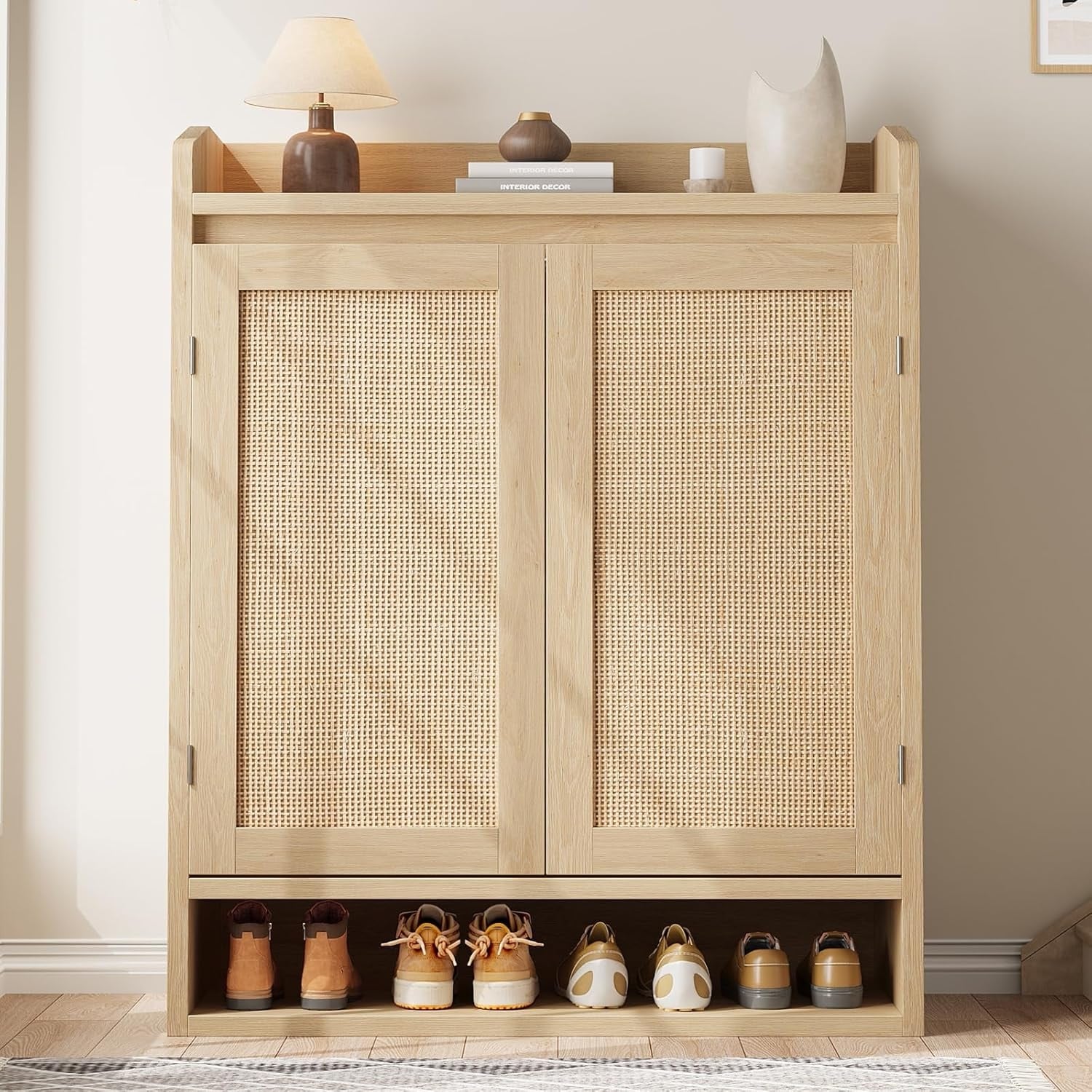 Shoe Cabinet with 2 Rattan Doors, Boho Shoe Rack Organizer with Adjustable Shelves, Wooden Shoe Cabinet 5-Tier Storage