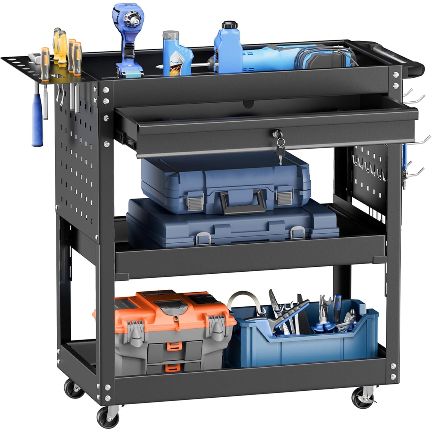 3 Tier Heavy Duty Rolling Tool Utility Cart With Storage and Wheels, Industrial Mechanic Carts with Drawers and Pegboard