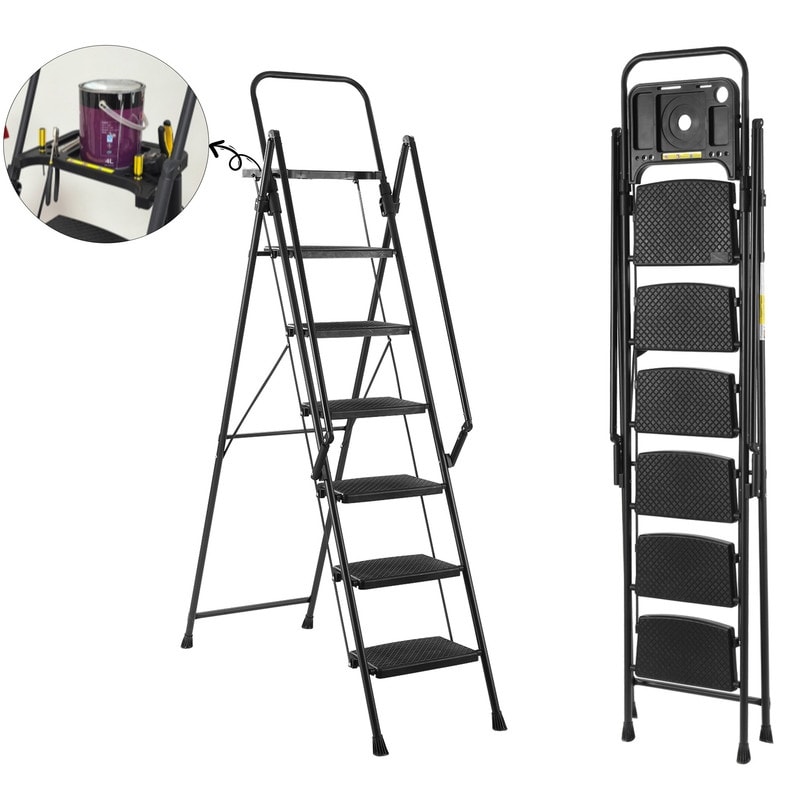 Foldable Steel Ladder with Tool Tray & Non-Slip Pedals - Lightweight Portable Step Stool with Safety Handles for Home Use