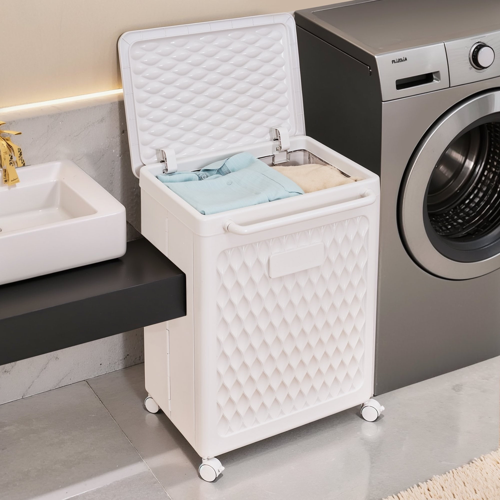 VECELO Rolling Laundry Basket L Size White Laundry Basket with Universal Wheels Handle and Lid for Laundry Room and Bathroom