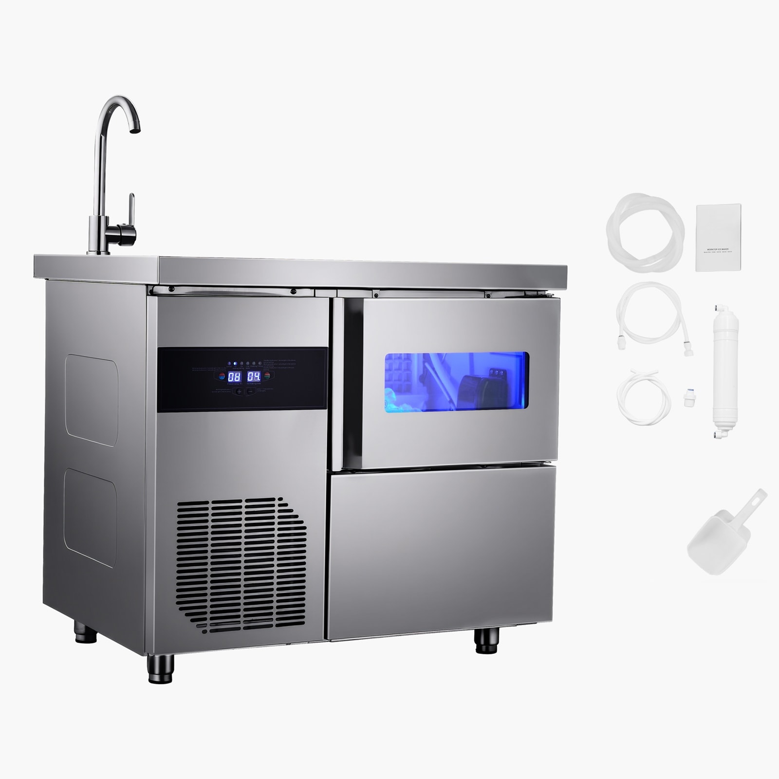 UIMOSO Commercial Ice Maker Machine, Stainless Steel Worktop Ice Machine with Sink, Self-Cleaning Freestanding Ice-Making