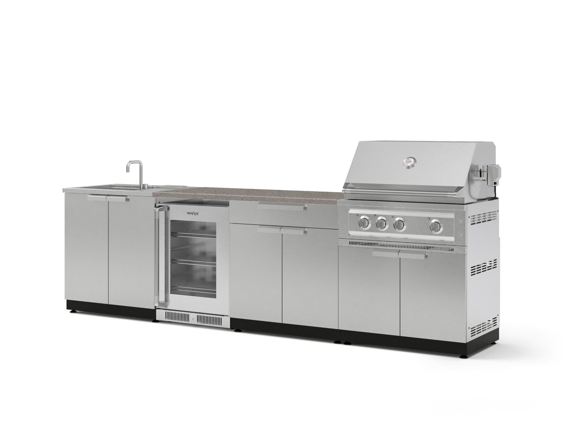 NewAge Outdoor Kitchens Stainless Steel 6-Piece Cabinet Set with Sink, Bar, Grill Cabinet, Platinum Grill, Countertop and Fridge
