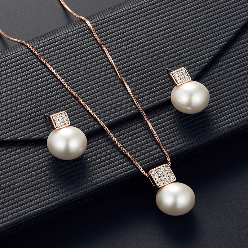 Elegant Imitation Pearl Pendant Women Necklace & Earring Stud Set, Snake Chain Square Metal Frame & Full Crystal Jewelry gold