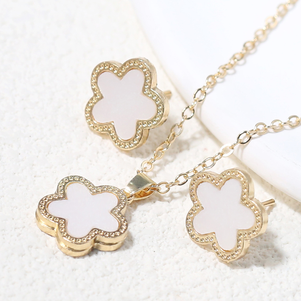 Luxury 2 Piece Stainless Steel Clover Jewelry Set: Fashionable Five Leaf Flower Pendant Necklace And Earrings For Women Metal Color: 2pcs Set White