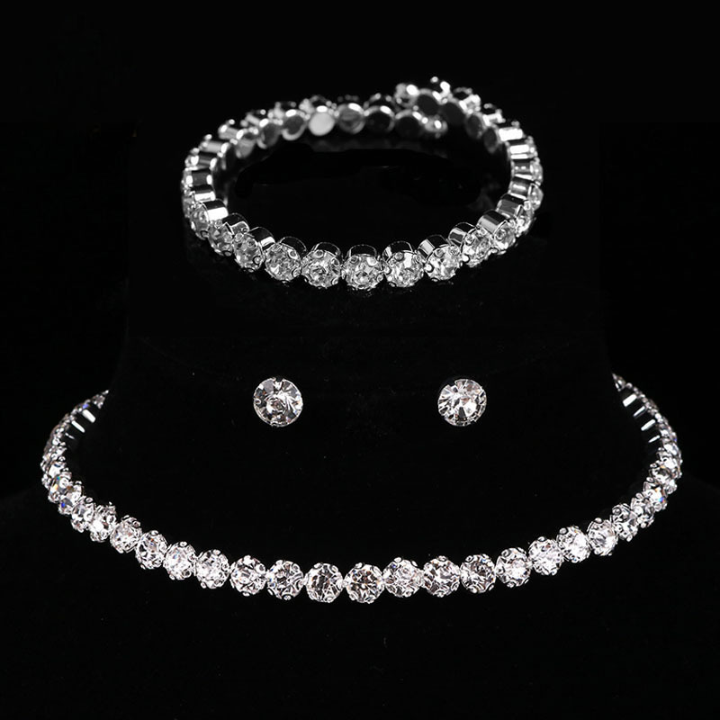 Elegant Silver Crystal Jewelry Set For Women: Bracelet, Stud Earrings, And Zircon Chain Necklace For Wedding & Parties silver