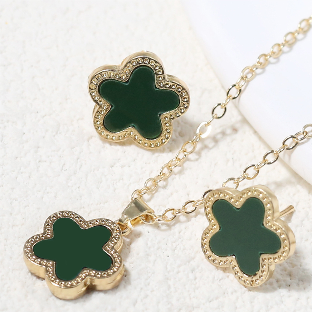 Luxury 2 Piece Stainless Steel Clover Jewelry Set: Fashionable Five Leaf Flower Pendant Necklace And Earrings For Women Metal Color: 2pcs Set Green