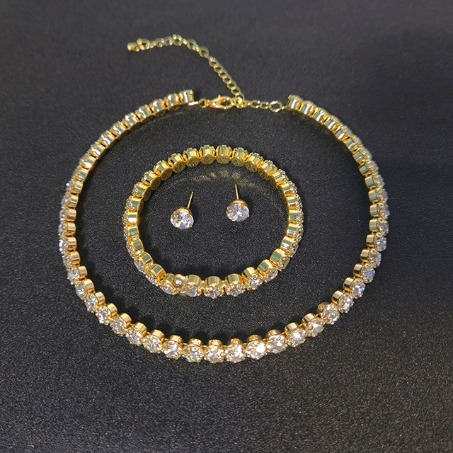 Elegant Silver Crystal Jewelry Set For Women: Bracelet, Stud Earrings, And Zircon Chain Necklace For Wedding & Parties gold