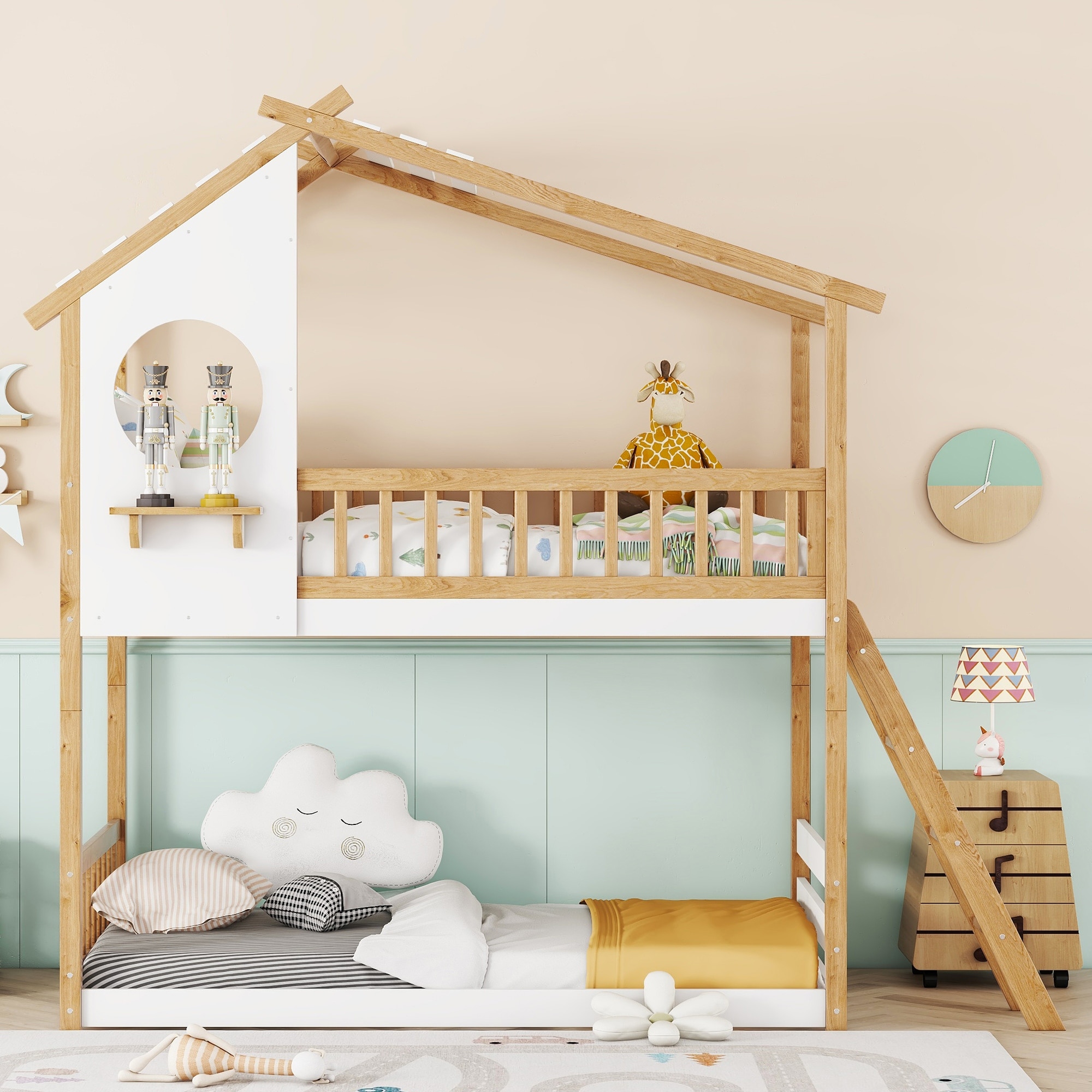 Twin Over Twin Bunk Bed with Roof & Window, Space-Saving Wood Bunk Bed Frame with Safety Guardrails & Ladder for Small Bedrooms