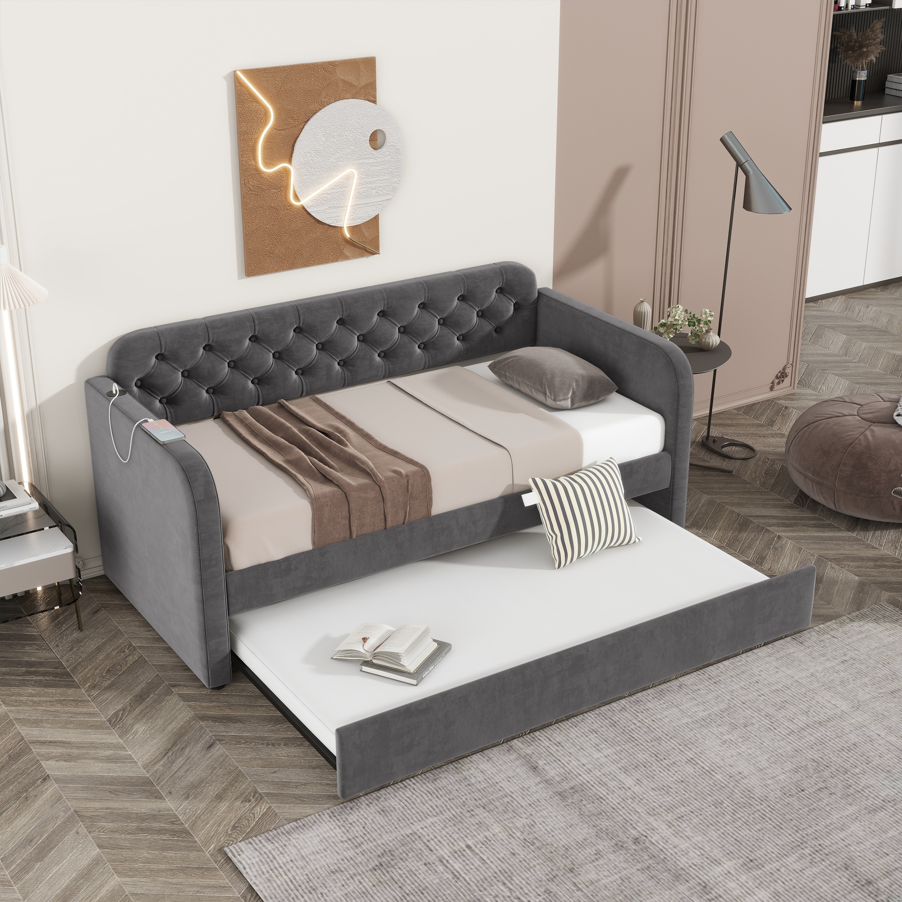 Upholstered Daybed Wooden Sofa Bed Frame, Twin Bed with Trundle & USB