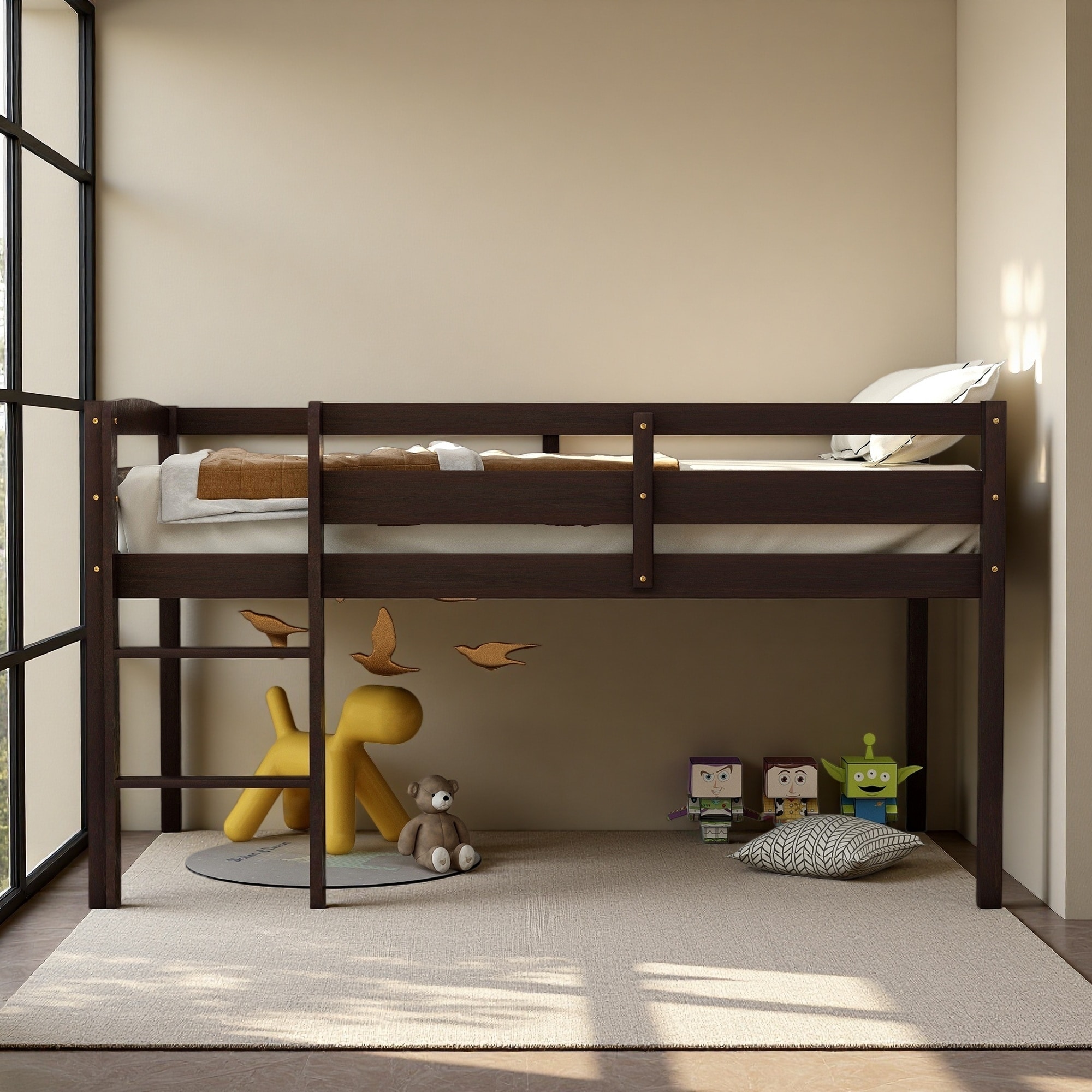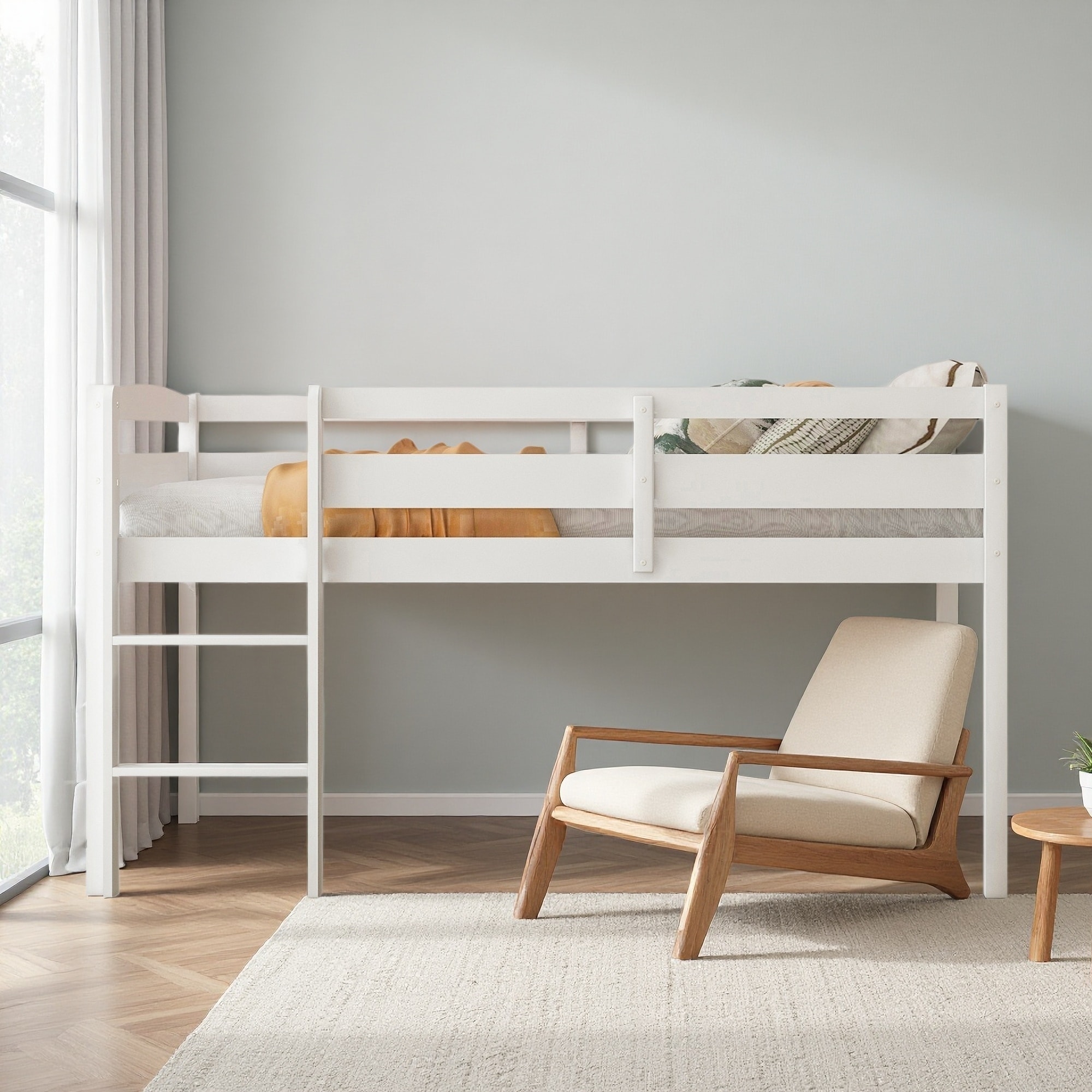 Twin Size Wood Loft Bed with Ladder, Low Loft Design & Solid Pine + MDF Frame, Space-Saving Twin Loft Bed