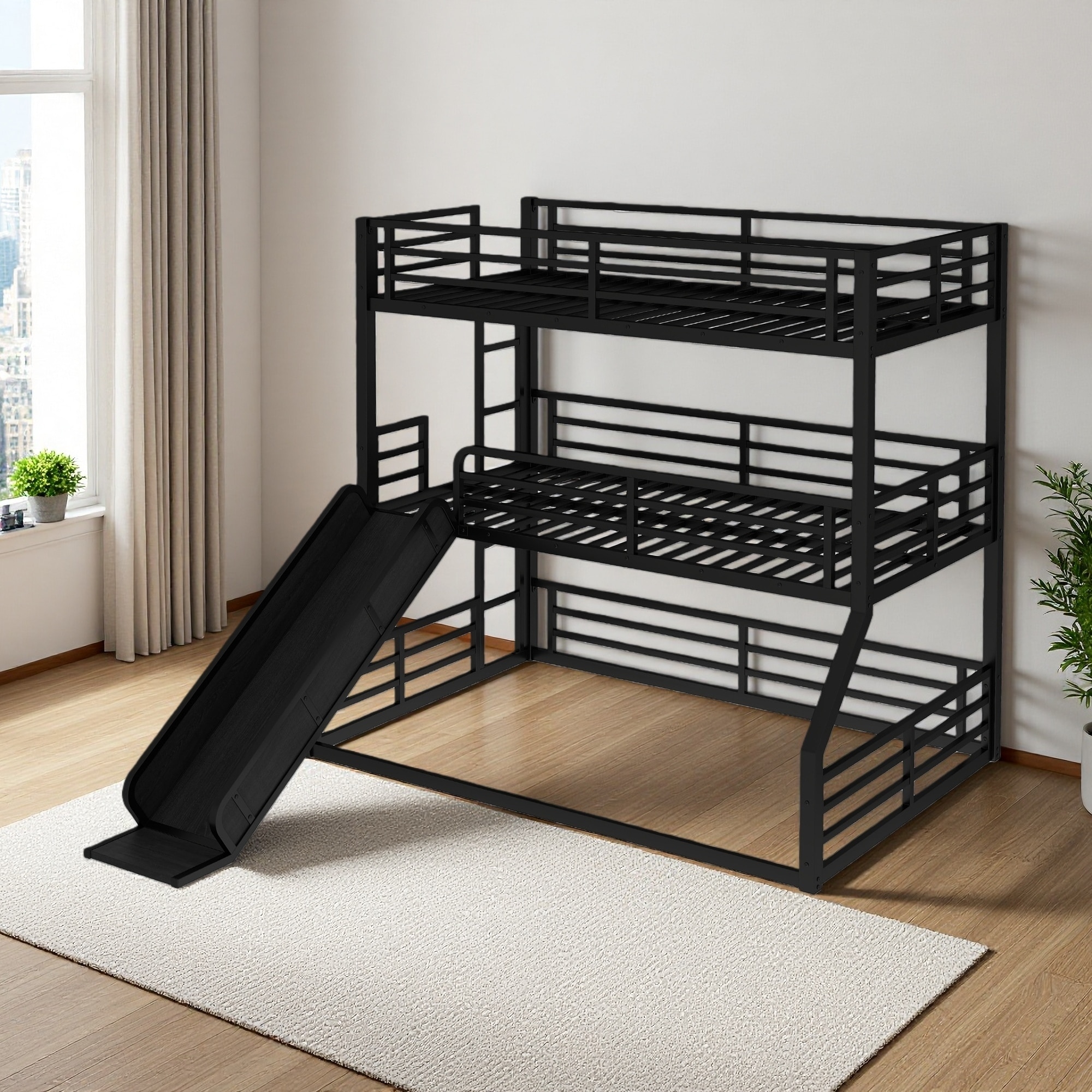 Twin over Twin over Full Metal Triple Bunk Bed with Slide, and Safety Guardrails