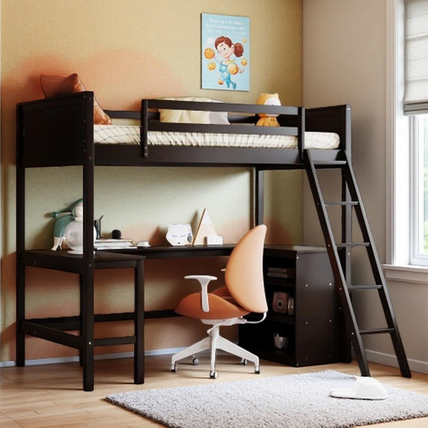 Twin Wooden Loft Bed Frame with Integrated Desk and Book Shelves, Space-Saving Study Bed with Safety Guardrails and Ladder