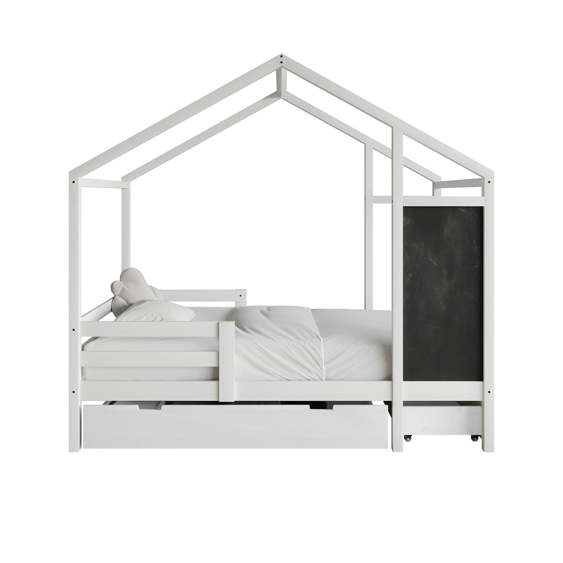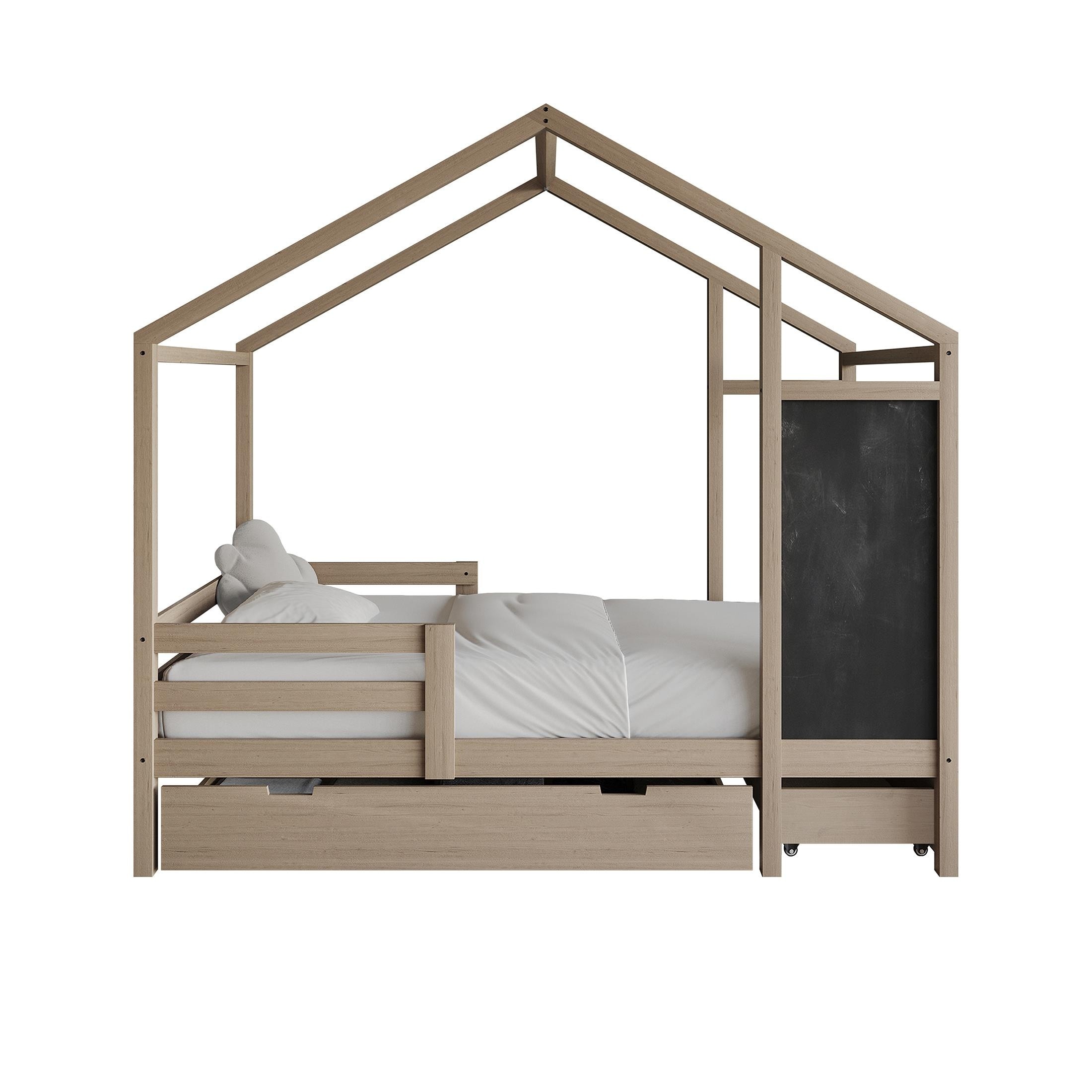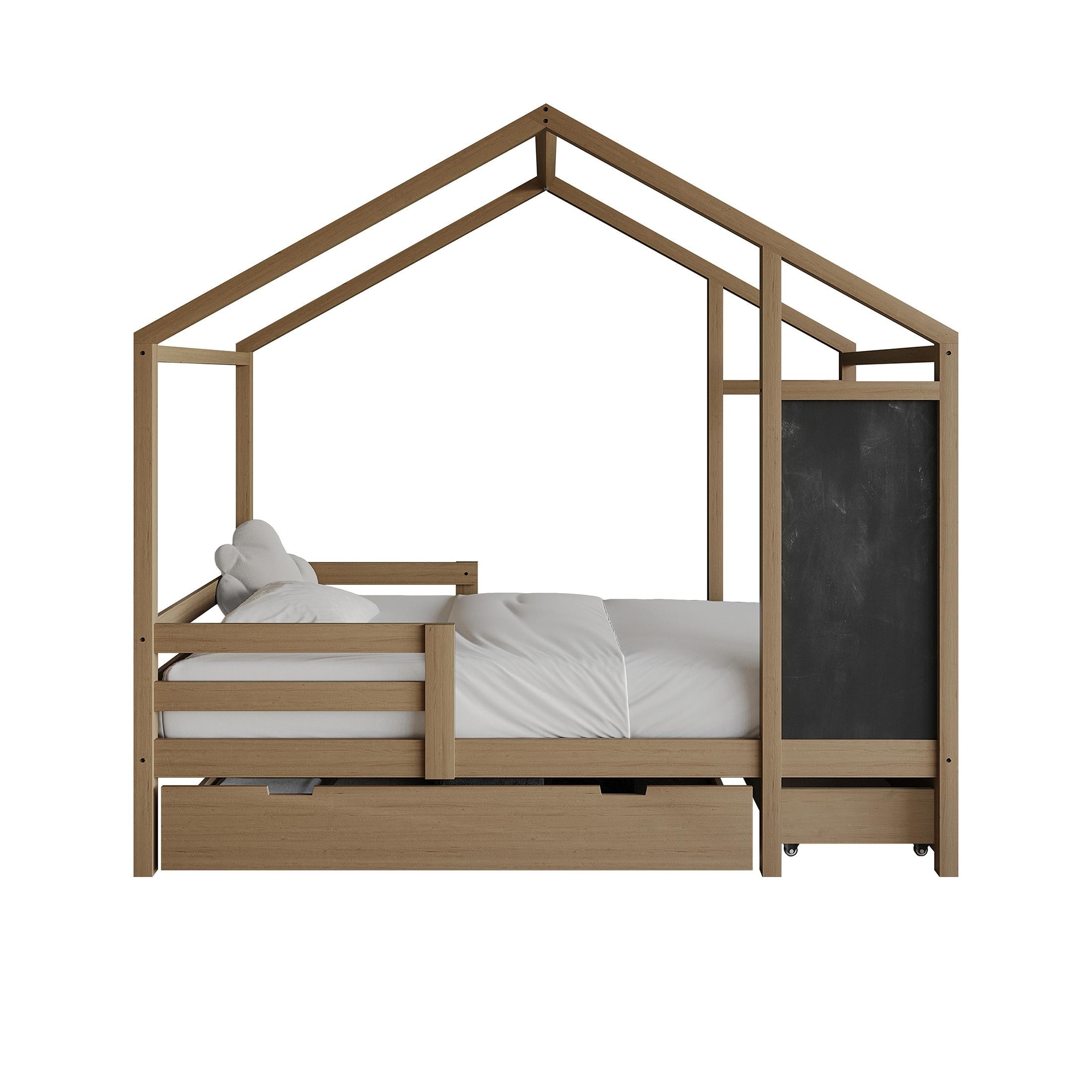 Twin Size Wood House Bed Frame with Fence & Door, for Boys or Girls