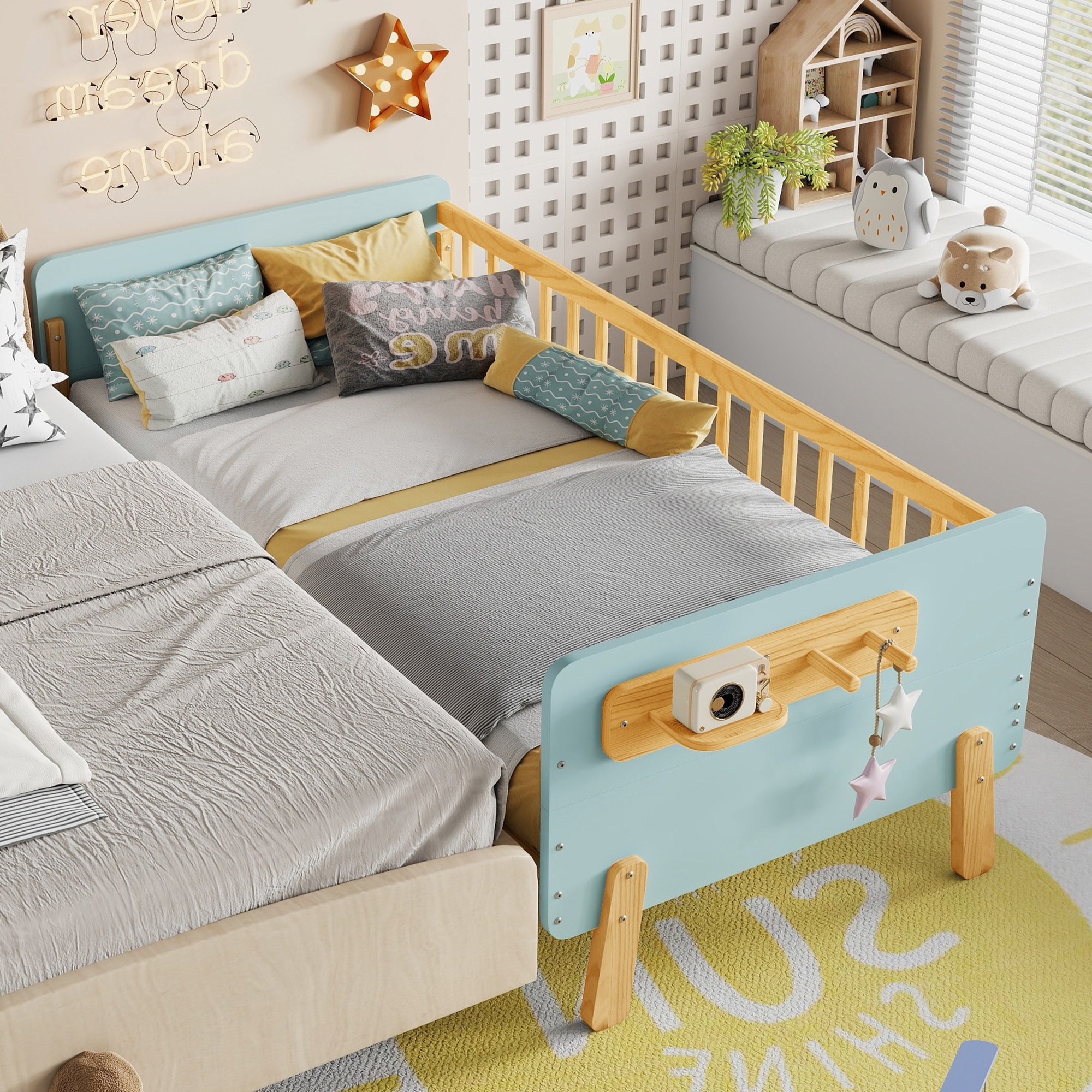 Twin/Full Size Kids Bed Frame with Removable Guardrail, Small Shelf & Hooks, Wooden Platform Bed with Headboard & Footboard