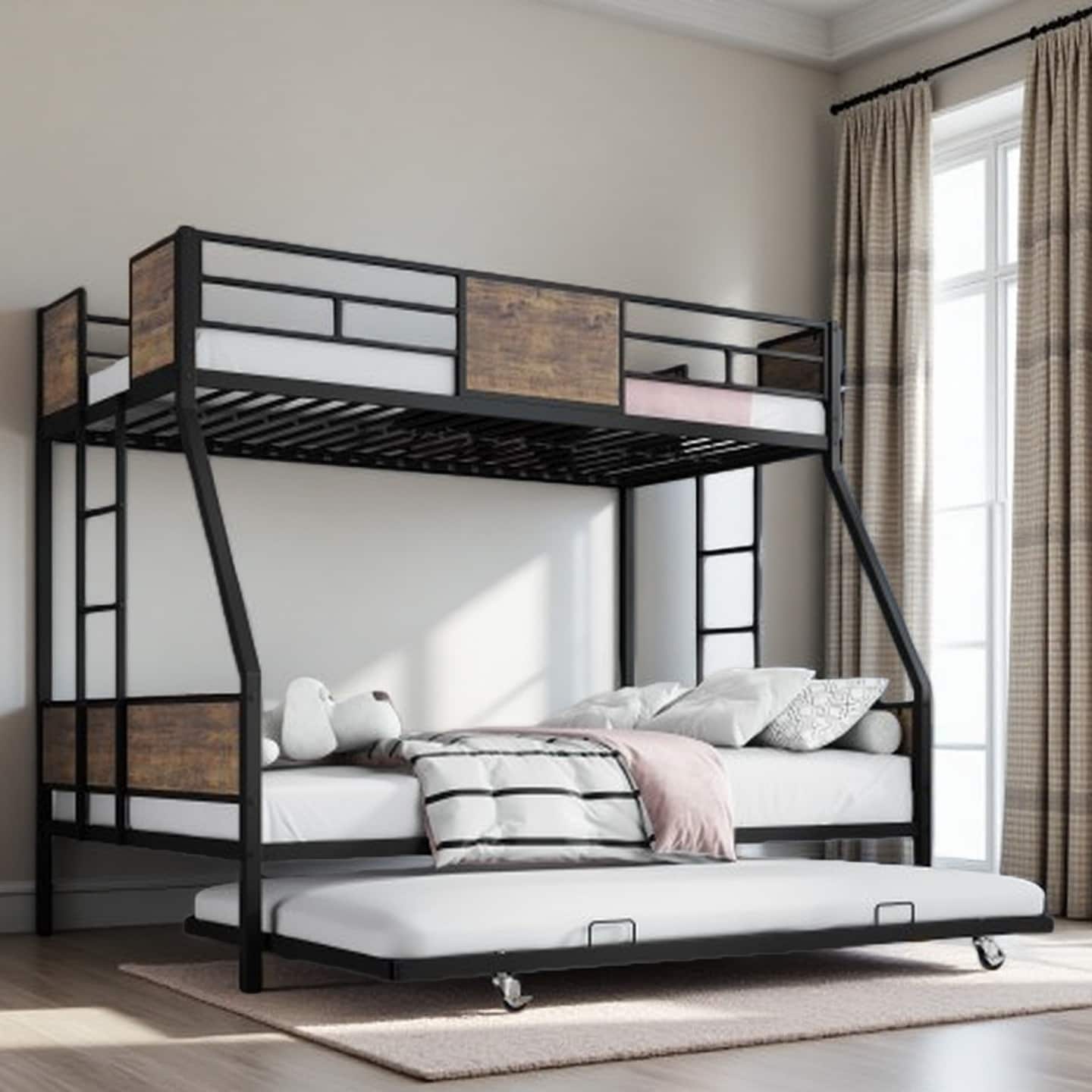 Twin Over Full Bunk Bed with Trundle, Sturdy Metal Frame, Dual Ladders, Full-Length Guardrails