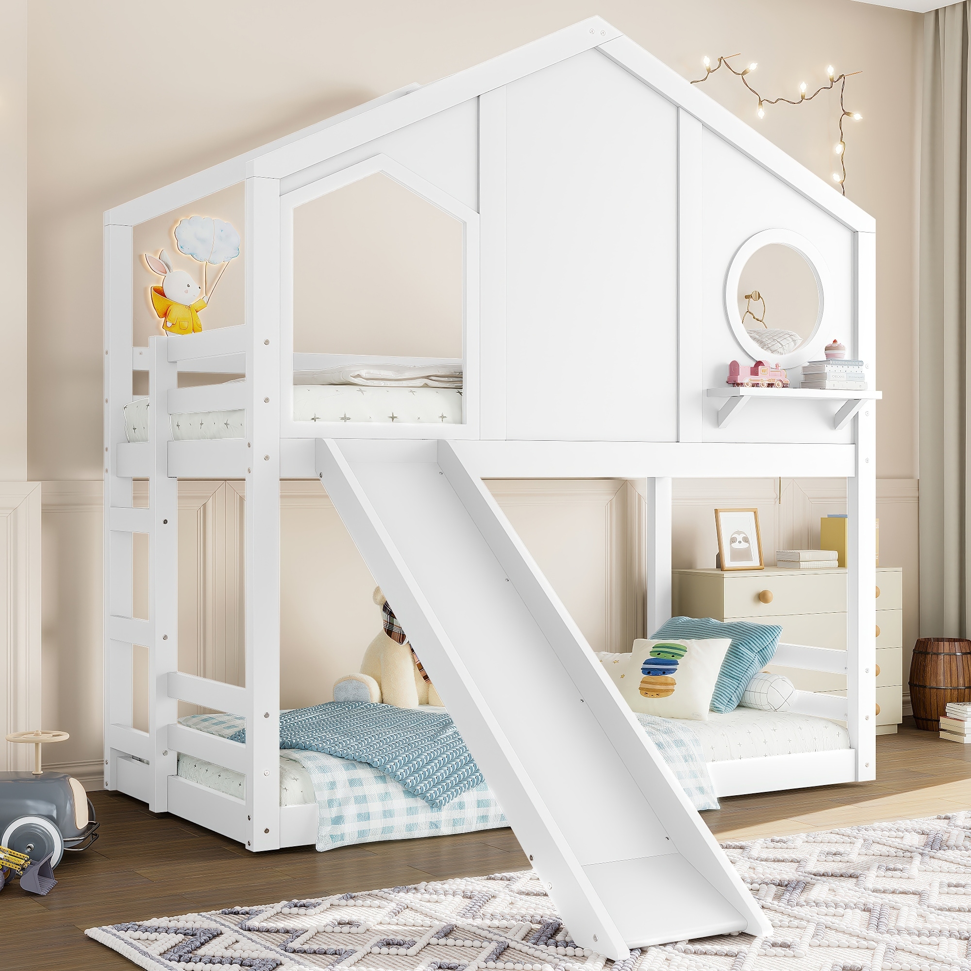 Twin Over Twin House Bunk Beds with Window for Kids Solid Wood Playhouse Bunk Bed with Slide and Side Storage Shelves