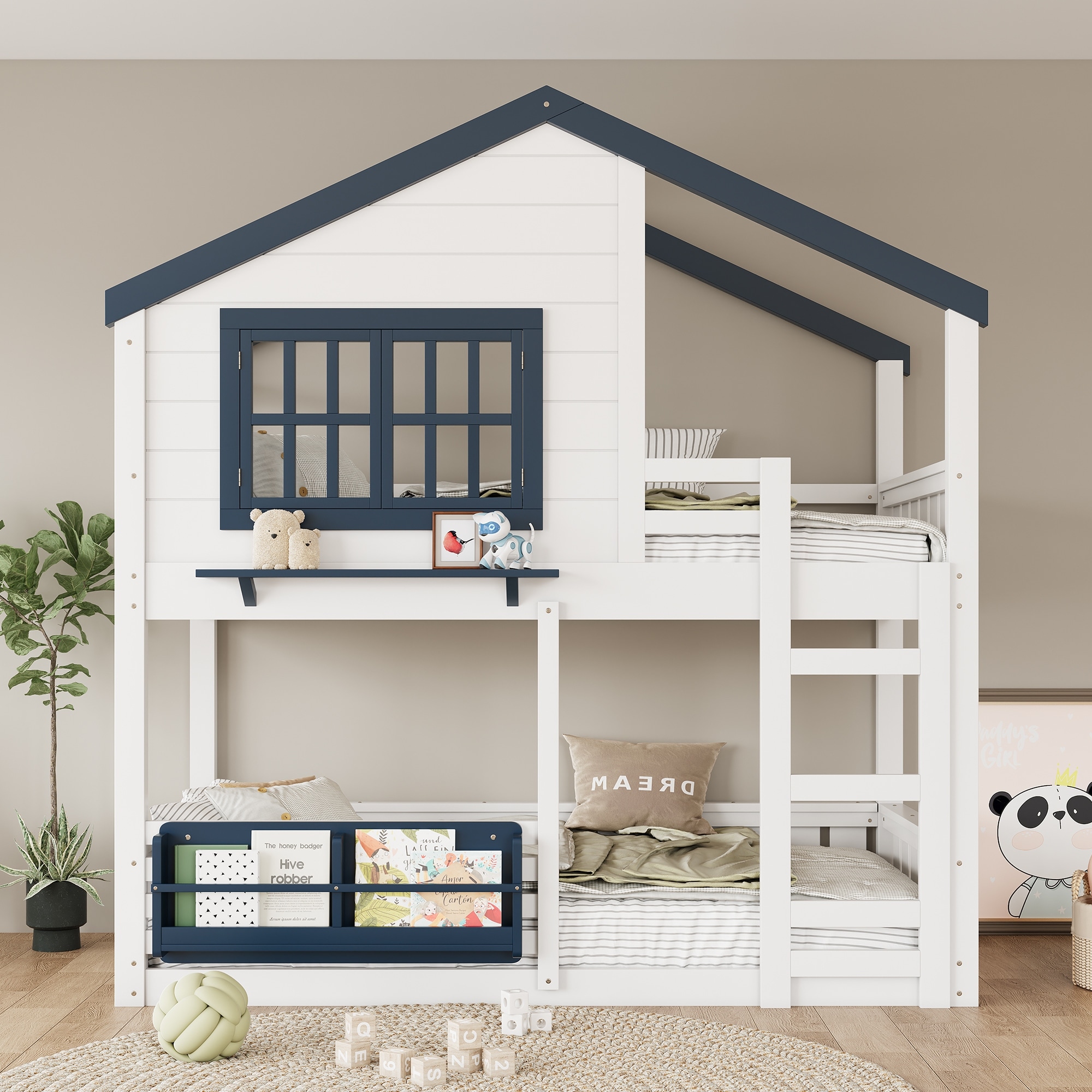 Twin over Twin/Full over Full Size House Bunk Bed with Bookshelf, Floor Bunk Bedframe w/ Safety Guardrail, Window & Roof Design