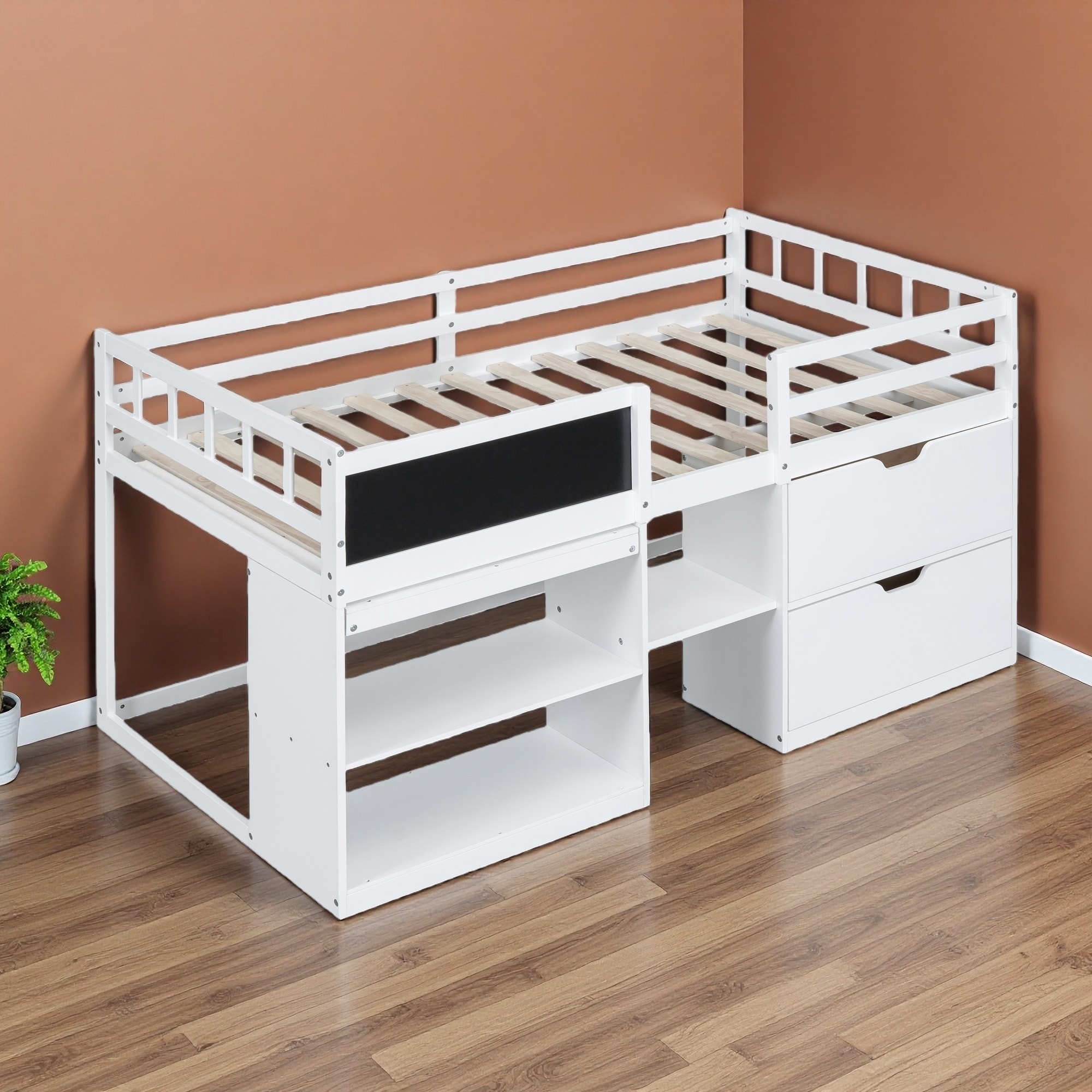 Twin Size Solid Wood Low Loft Bed with Rolling Desk, 2 Drawers and Shelf