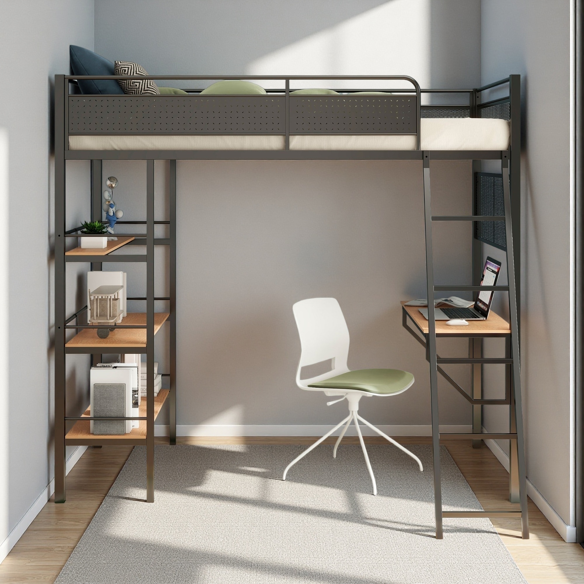 Twin Size Matte Black Metal & Wood-Look Loft Bed with 3 Shelves, Built-In Desk, Space-Saving Twin Loft Bed