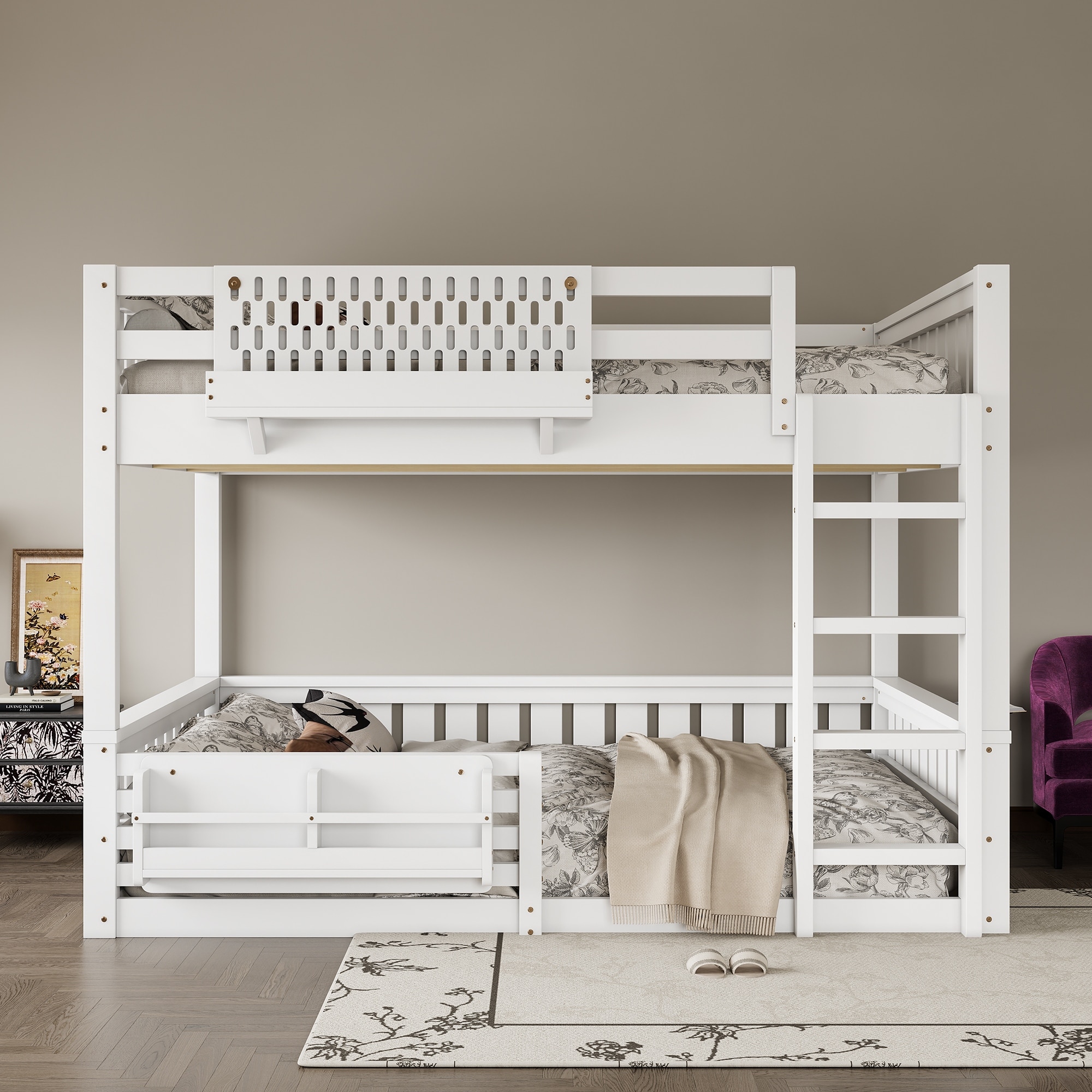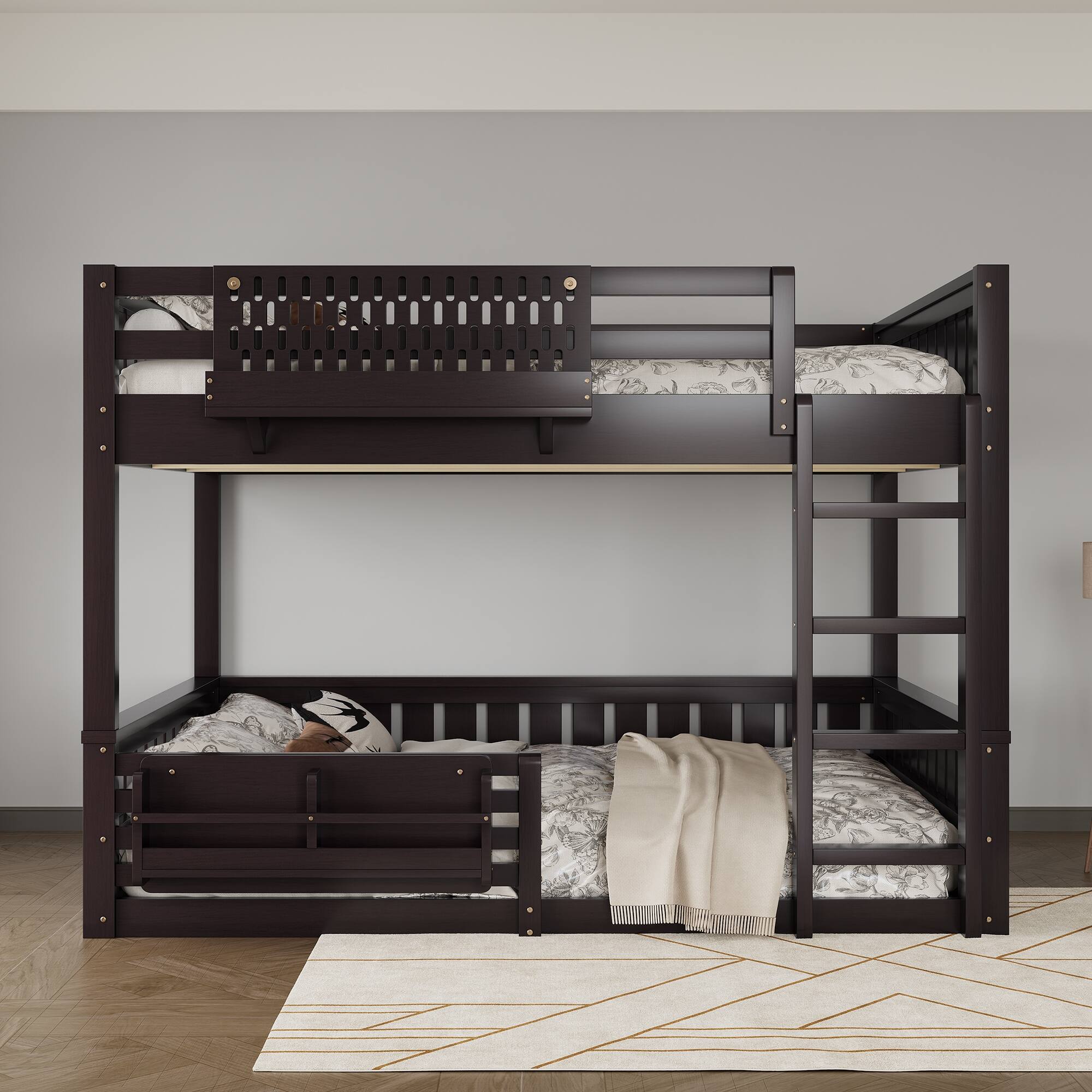 Bunk Bed Floor Bed Wooden Bedframe w/ Bookshelf, Ladder and Guardrails