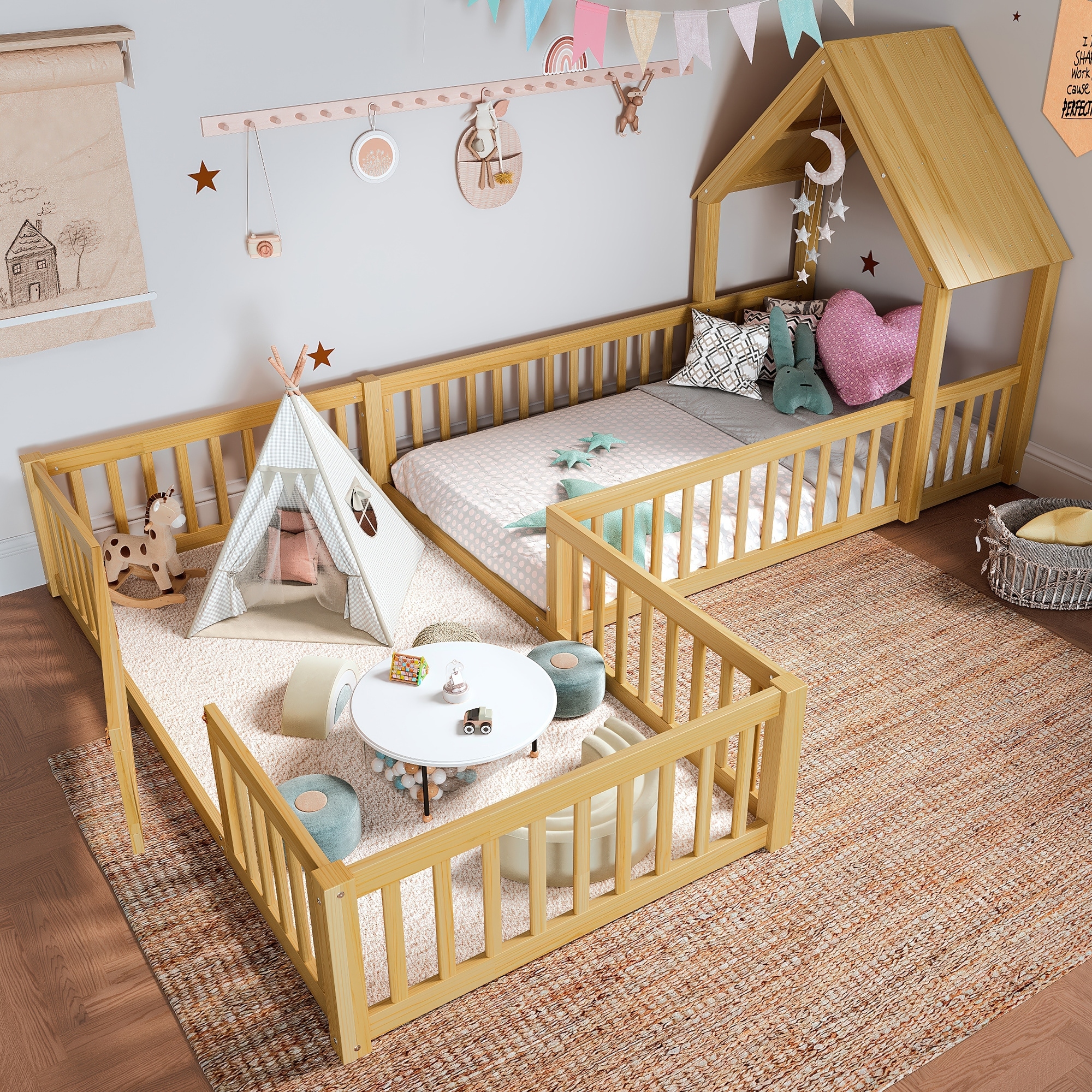 Modern House Floor Bed Frame, Double Floor Beds with Fence and Door