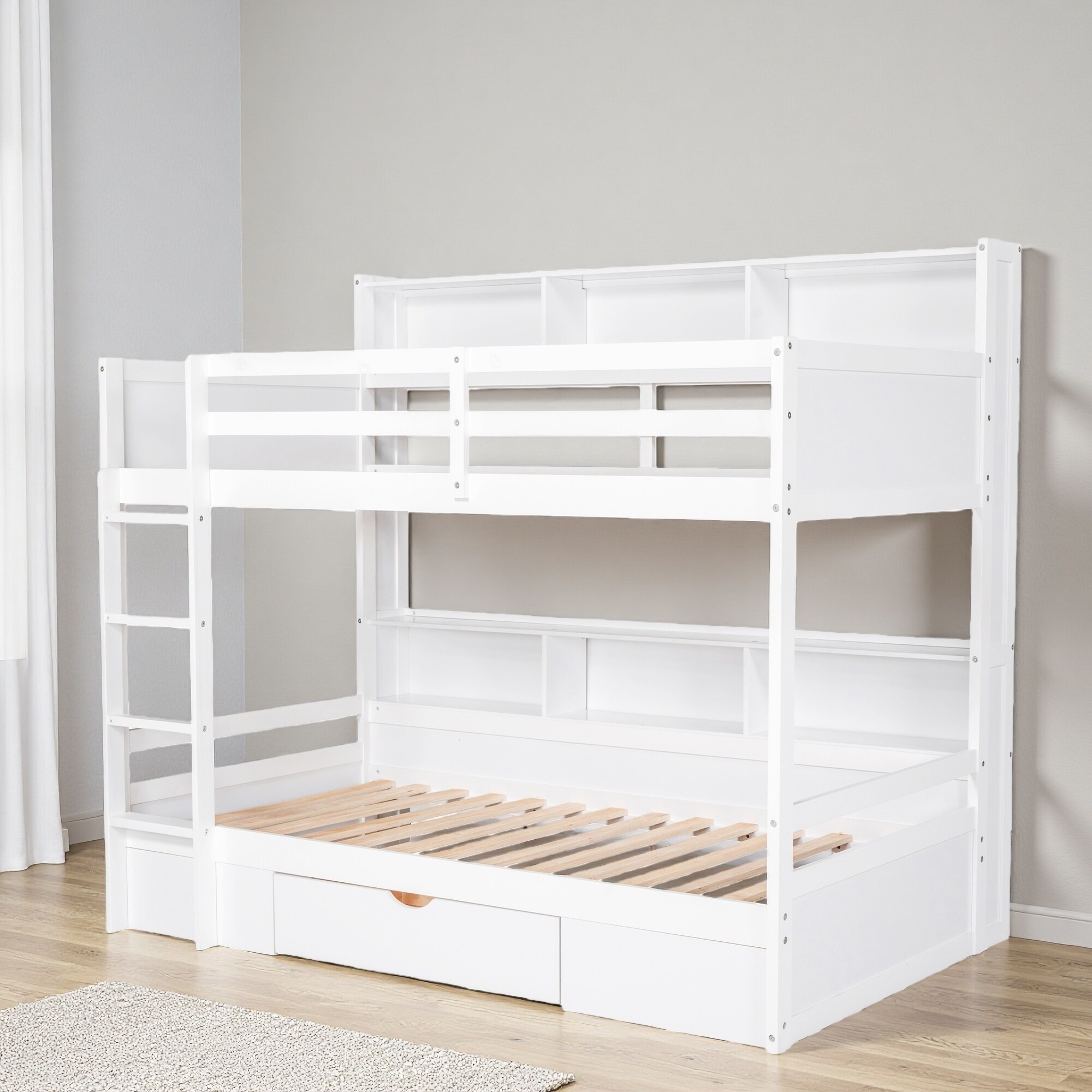 Twin Size Pine Bunk Bed with Built-in Shelves and Storage Drawer