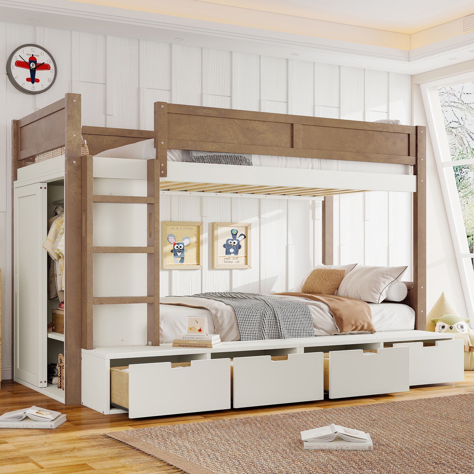 Twin over Twin Bunk Bed w/ 4 Storage Drawers & Built-in Wardrobe