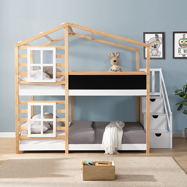House Bunk Bed with Roof Windows, Chalkboard & Storage Ladder - Solid Bed Frame.