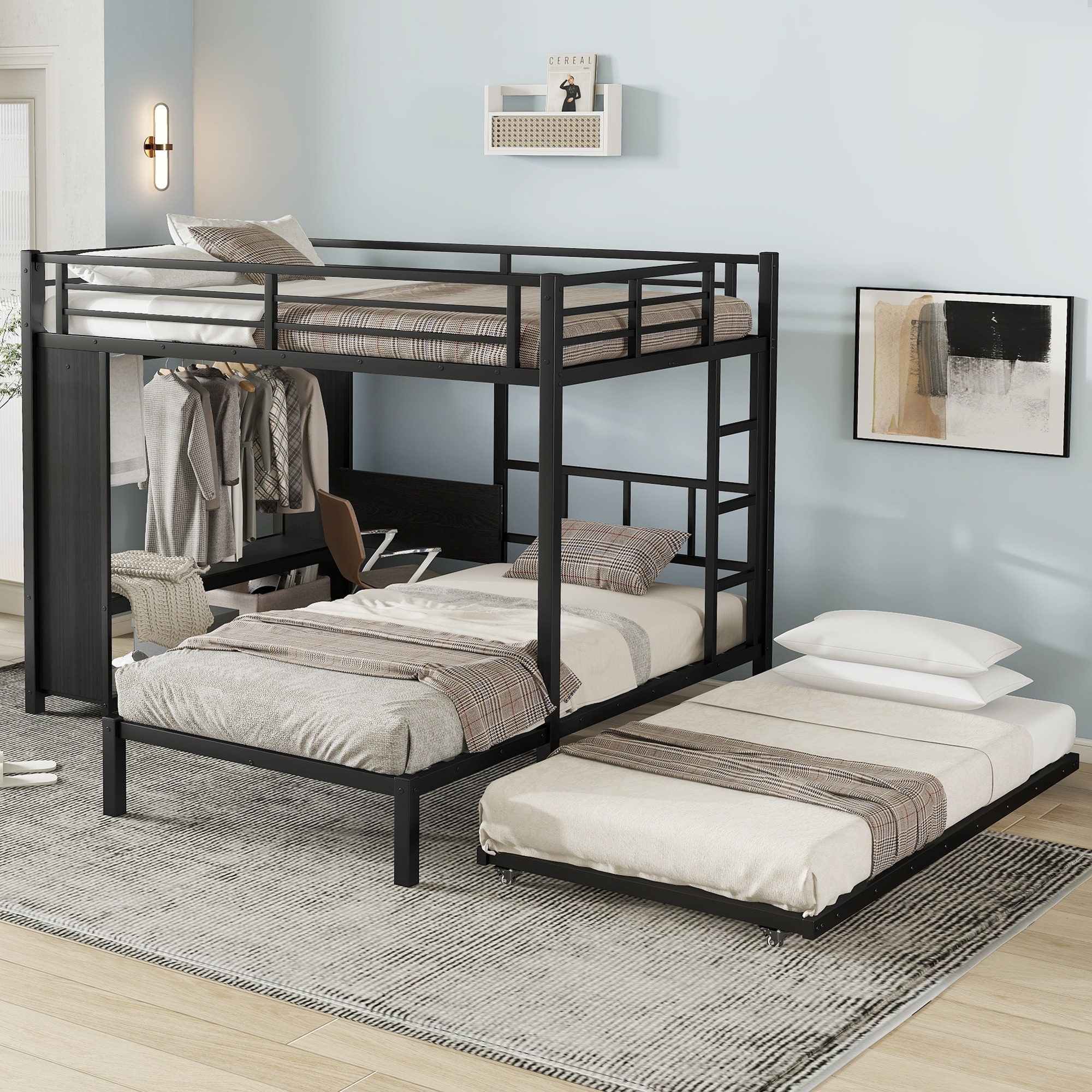 Metal Bunk Bed with Trundle,Foldable Desk,Ladders,Built-in Wardrobe