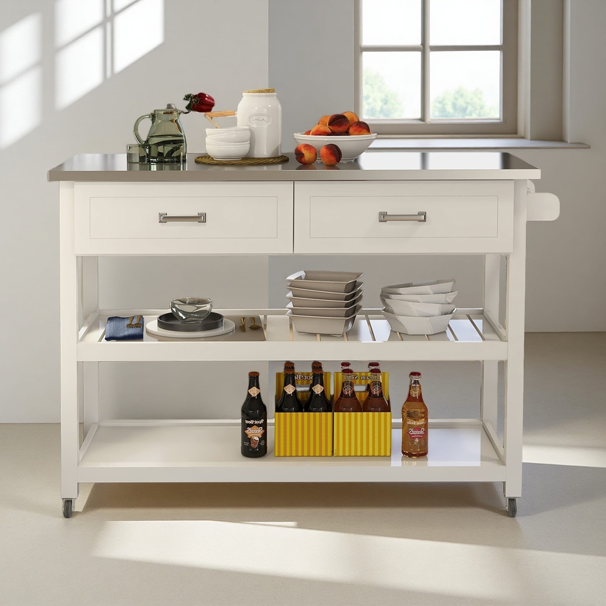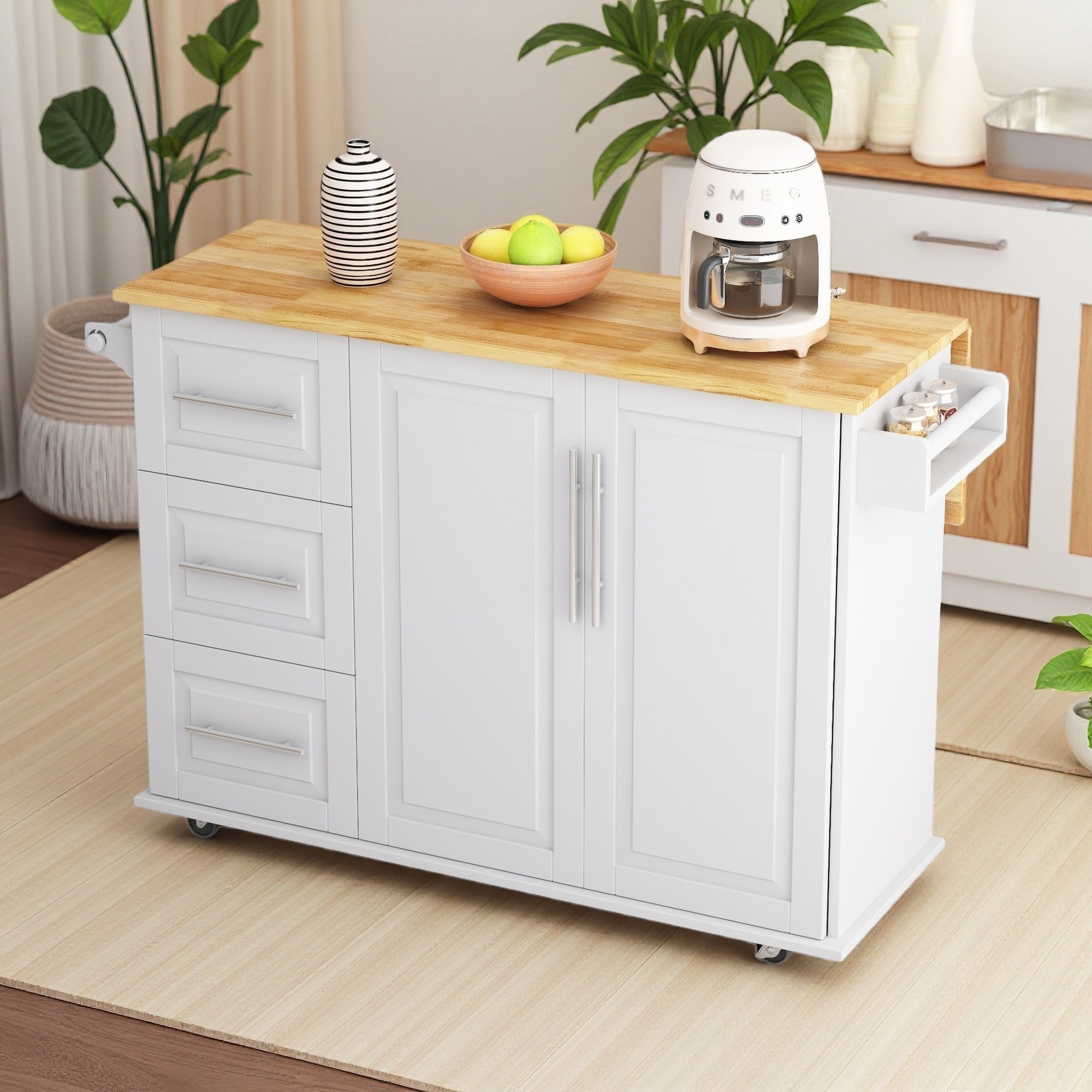 Kitchen Cart with Drawers, Rubber Wood Top and Adjustable Shelf