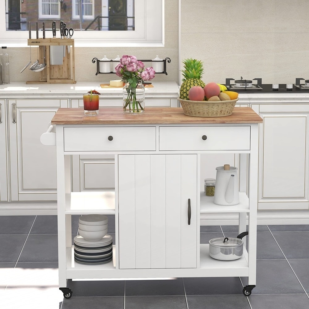Kitchen Island Cart Rubber Wood Top Locking Wheels