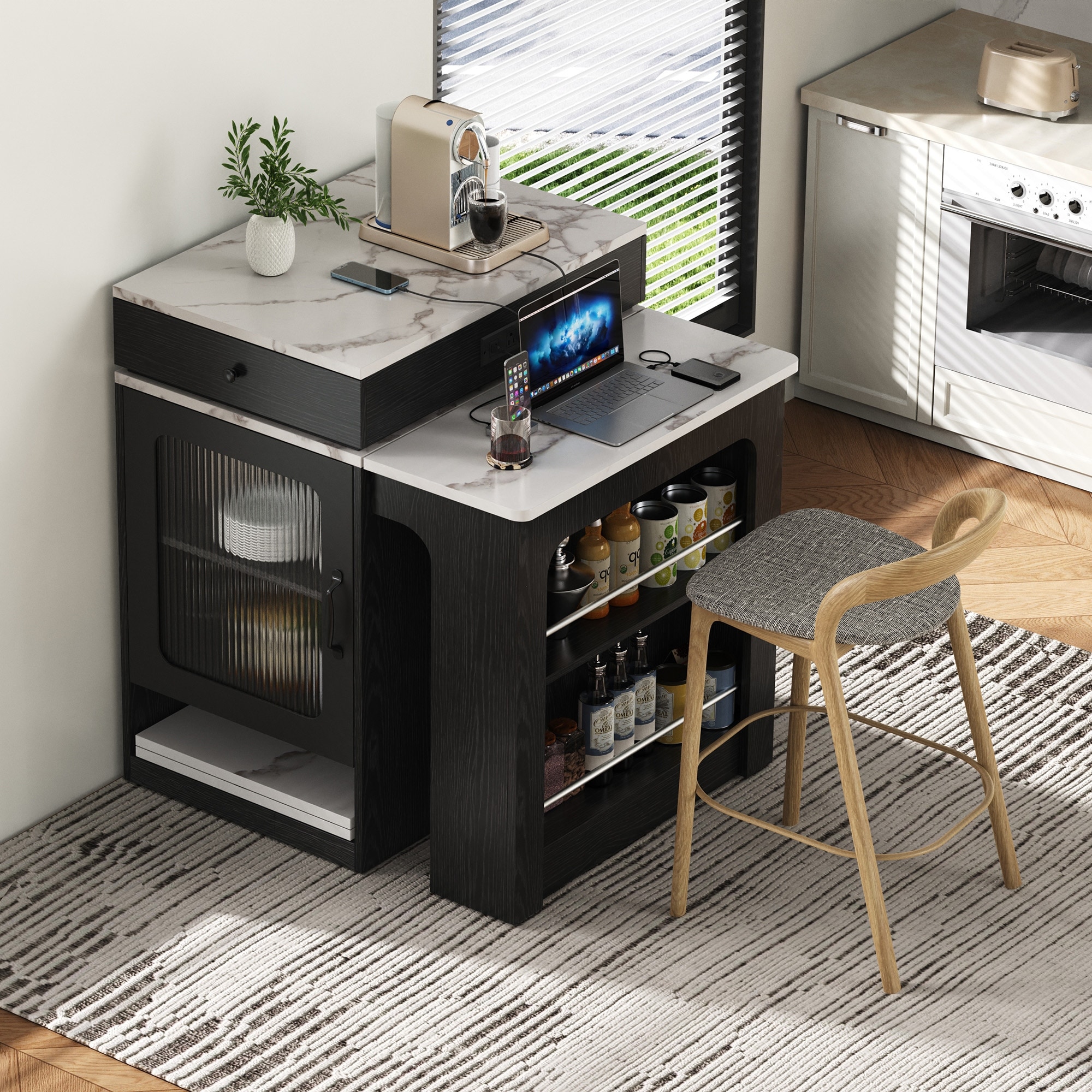 Fluted Kitchen Island with Trash Can Cabinet, Power Outlet, and Storage Racks