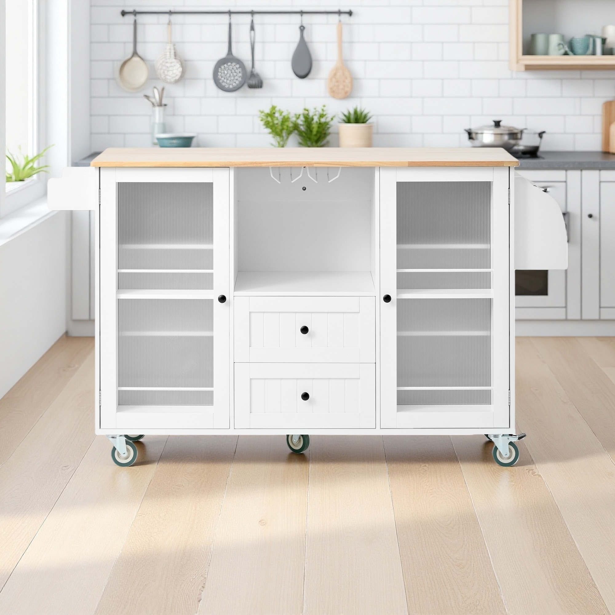 Kitchen Island with Two Tempered Glass Cabinet Doors, Power Outlet, Rolling Kitchen Cart on Wheels with Drop Leaf
