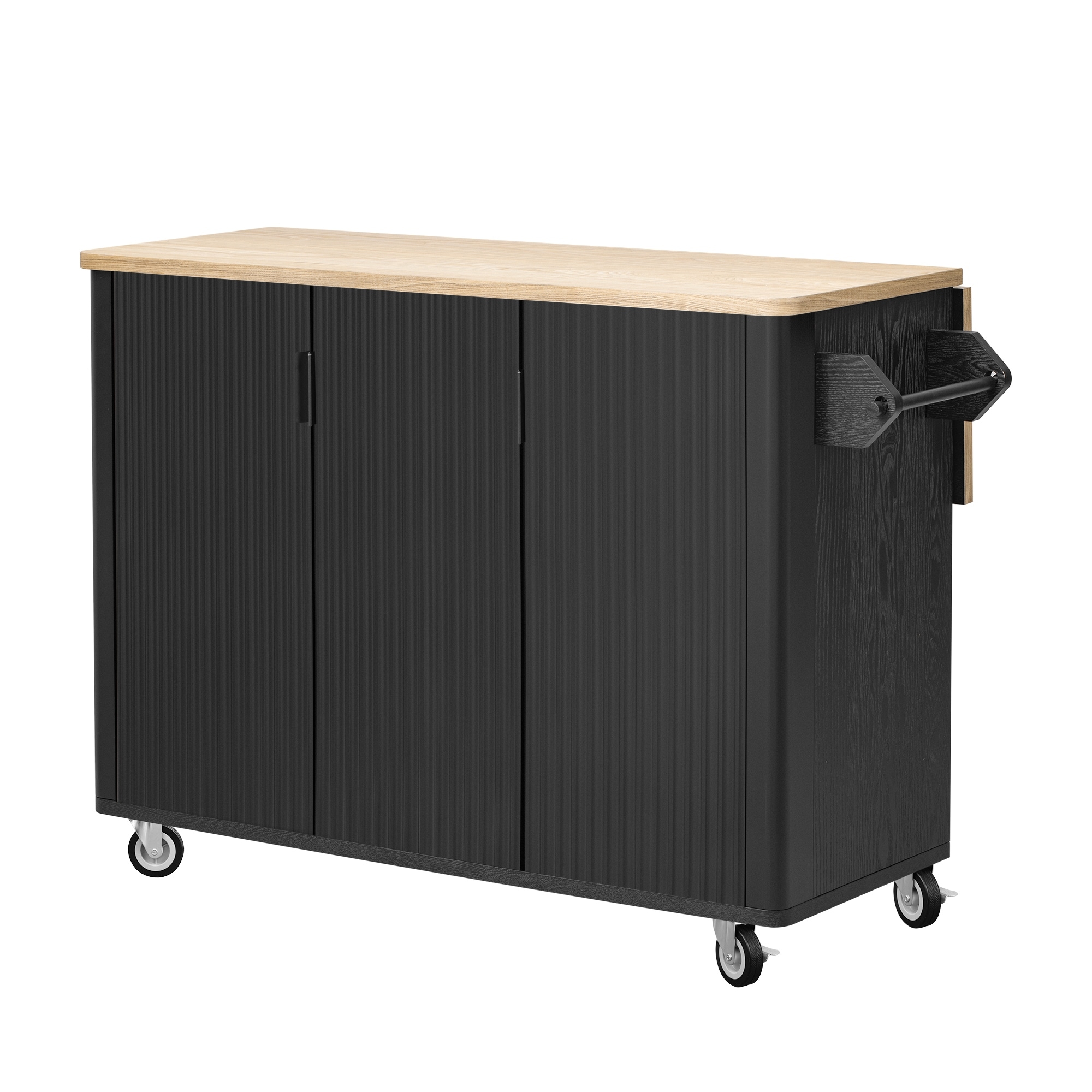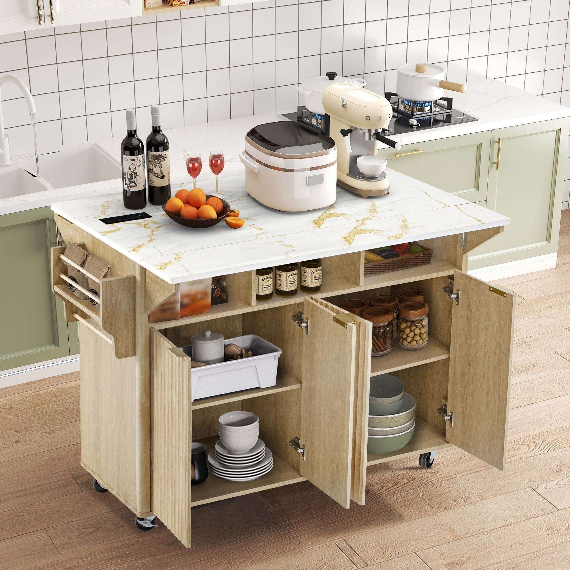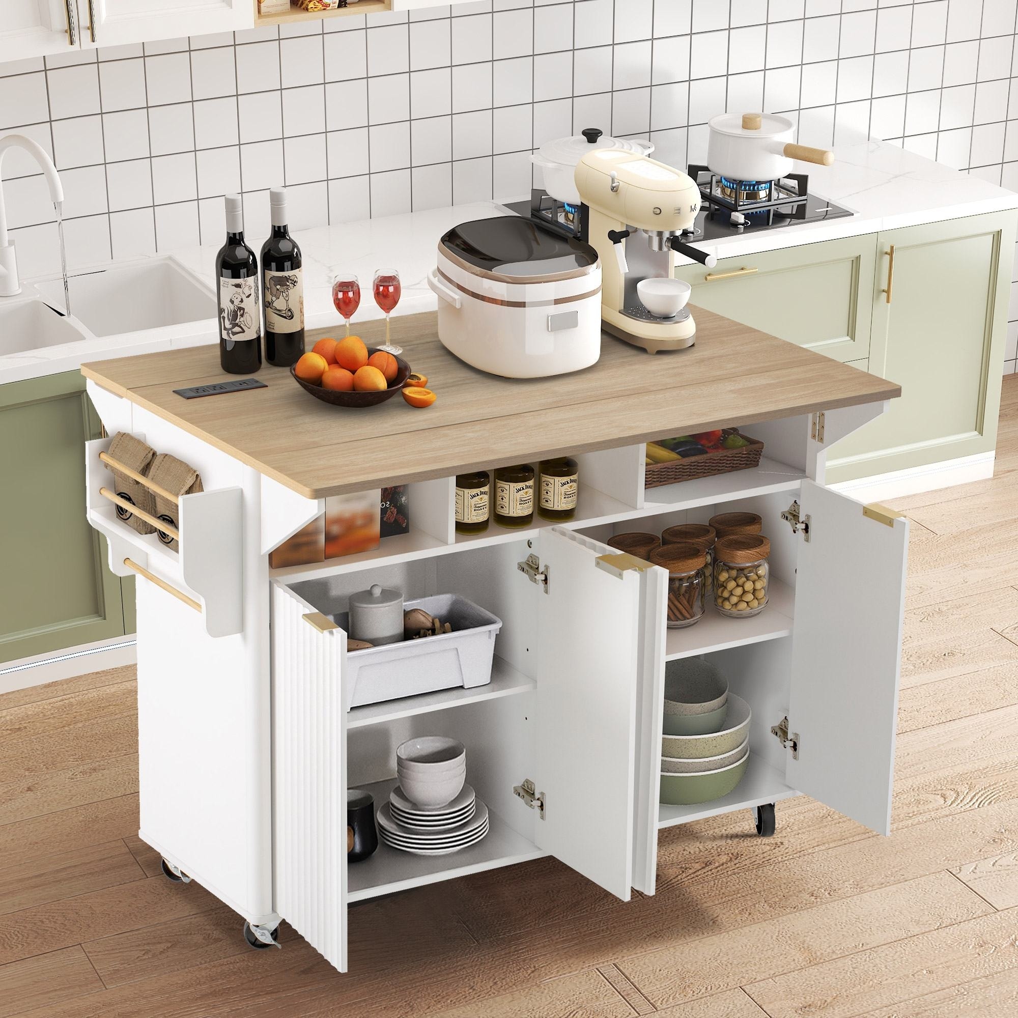 Fluted Kitchen Island with Drop Leaf and Internal Storage Rack, Farmhouse Rolling Kitchen Cart on Wheels with Towel Rack