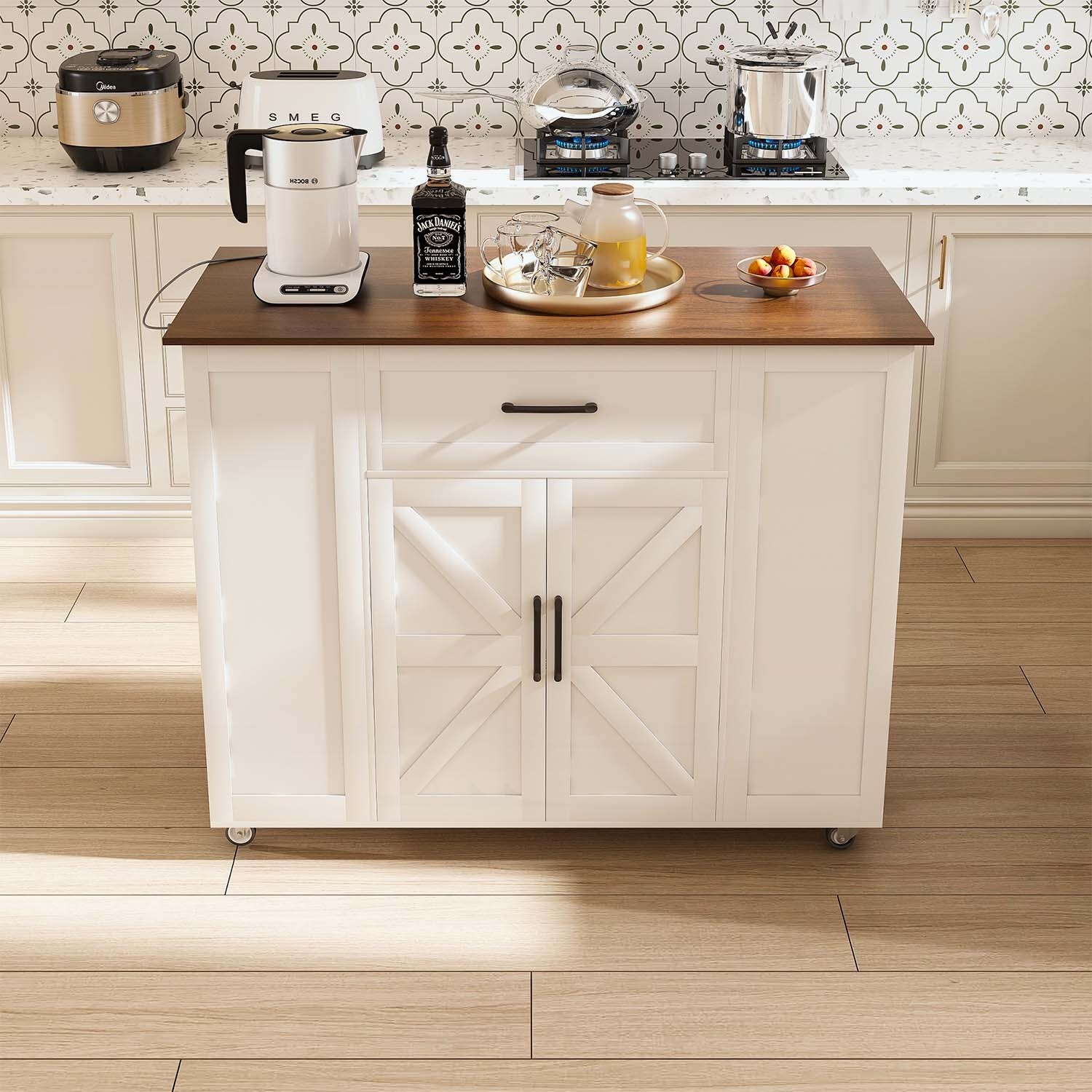 55 Inch Farmhouse Kitchen Island Drop Leaf Barn Door Power Outlet Wheels