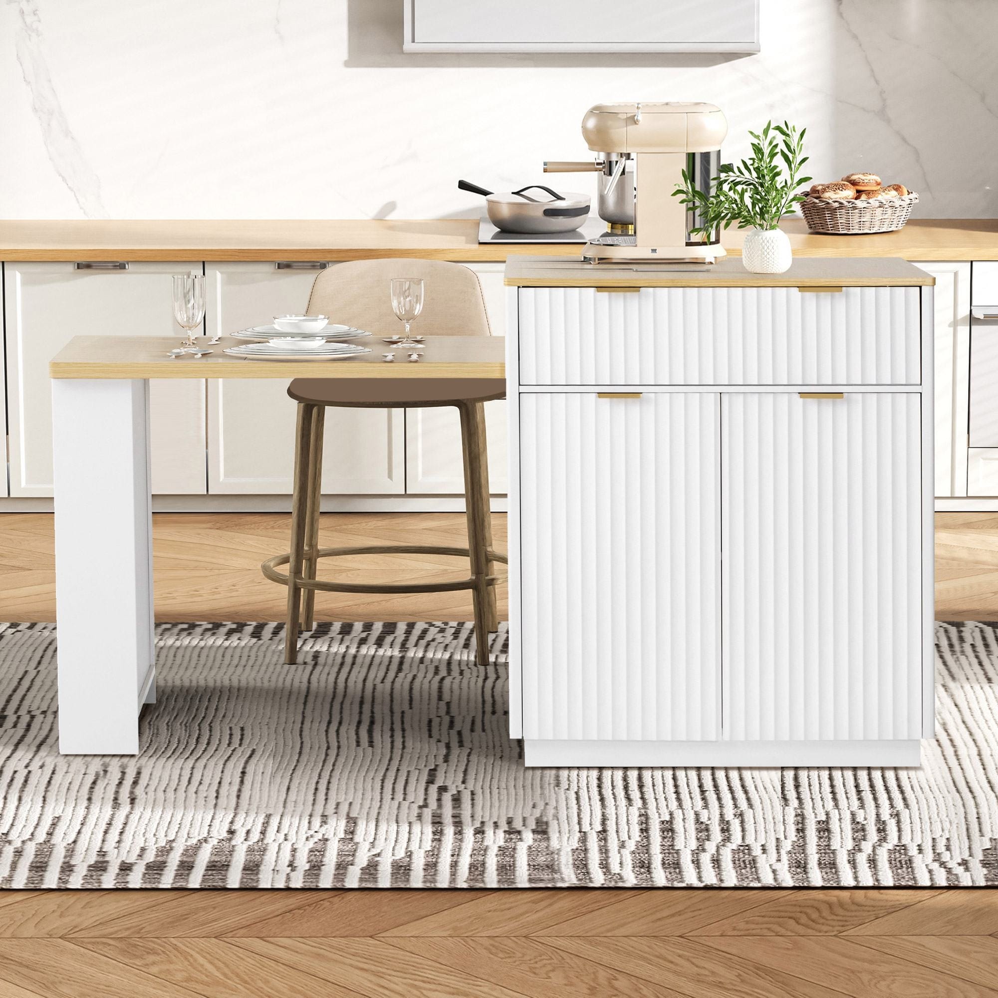 Modern Kitchen Island with Retractable Dining Table, Interior Storage Shelf, Power Socket, 2 Drawers and 2 Cabinets, for Kitchen
