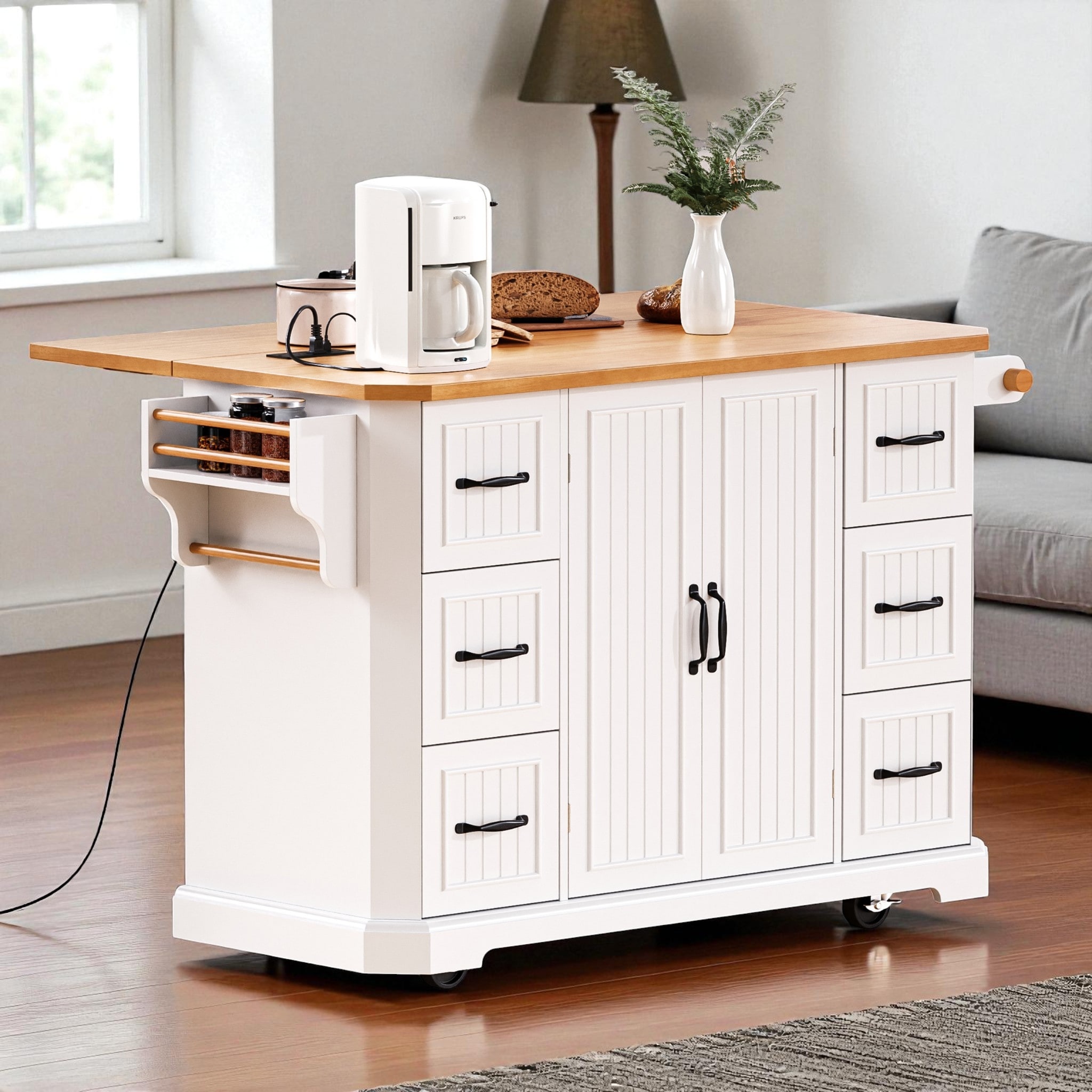 Farmhouse Kitchen Island with Drop Leaf, Drawers and Power Outlet, Rolling Kitchen Cart on Wheels w/Spice Rack & Storage Shelves